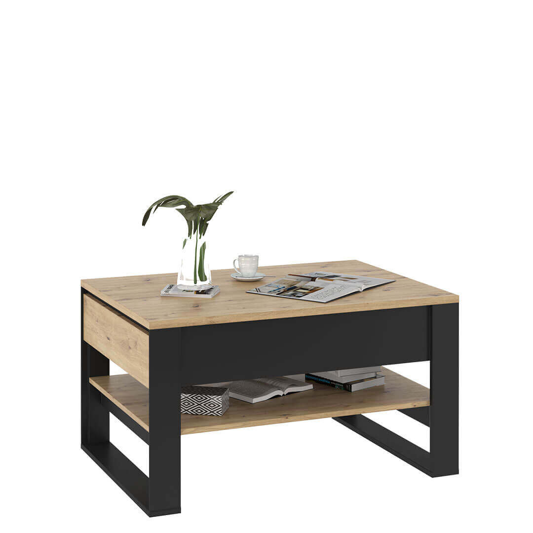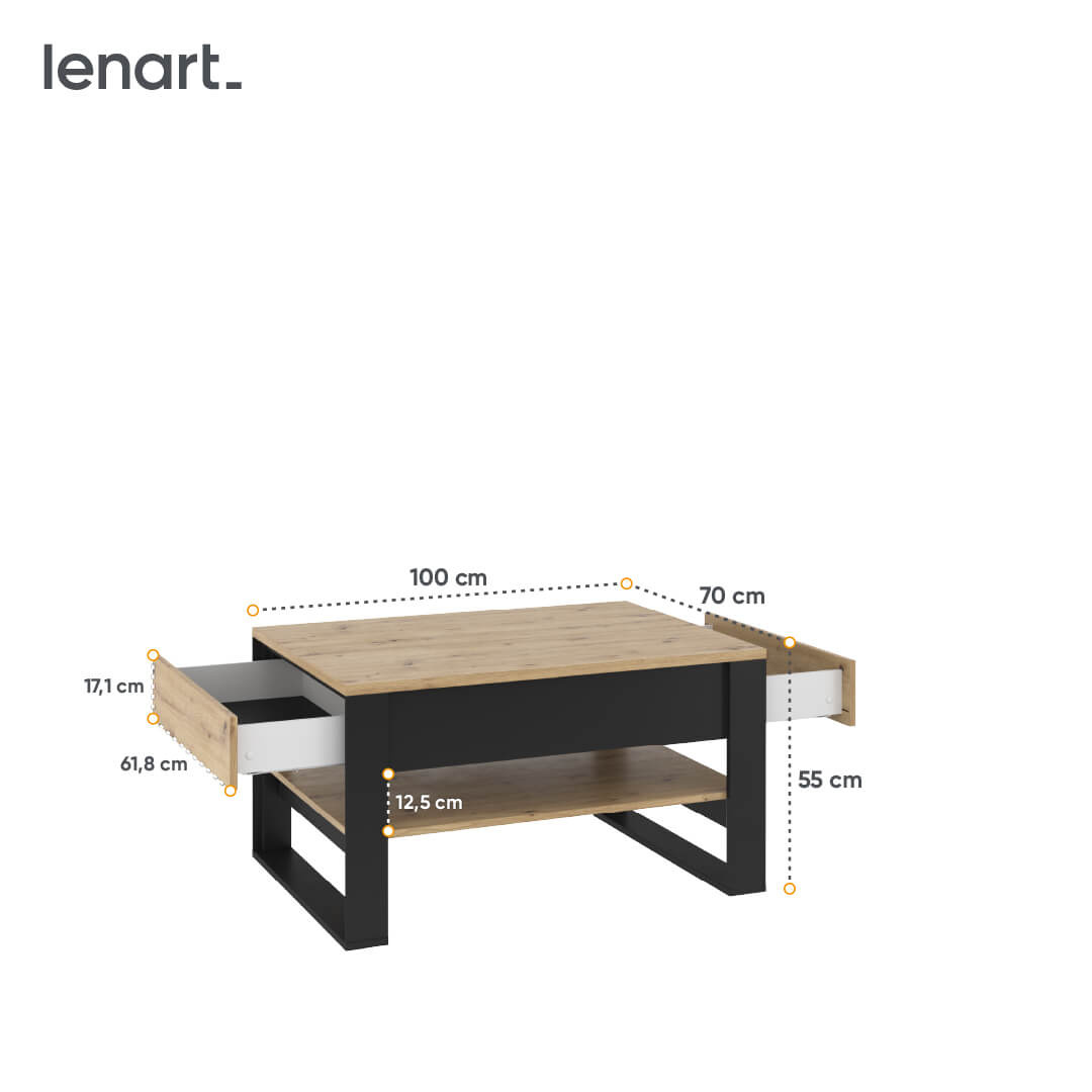 - Stylowy stolik kawowy QUANT QA-09 łączy nowoczesną elegancję z funkcjonalnością - dwa pojemne schowki i praktyczna półka. Wykończenie w kolorze dębu artisan/czarnym, wymiary: 100x55x70 cm.