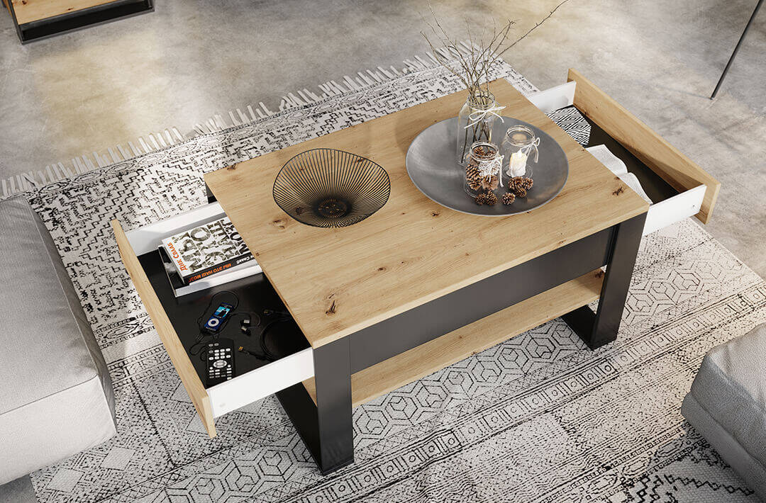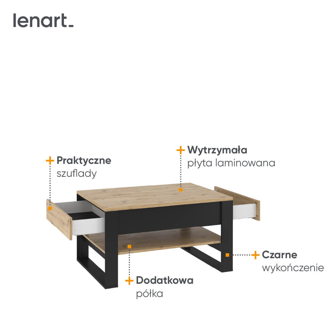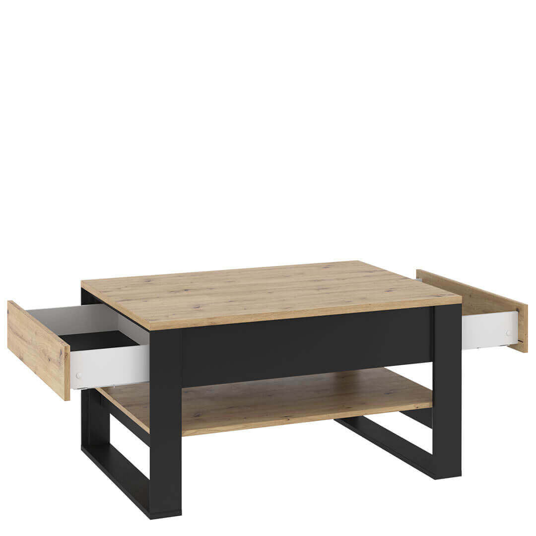 Stylowy stolik kawowy QUANT QA-09 łączy nowoczesną elegancję z funkcjonalnością - dwa pojemne schowki i praktyczna półka. Wykończenie w kolorze dębu artisan/czarnym, wymiary: 100x55x70 cm.