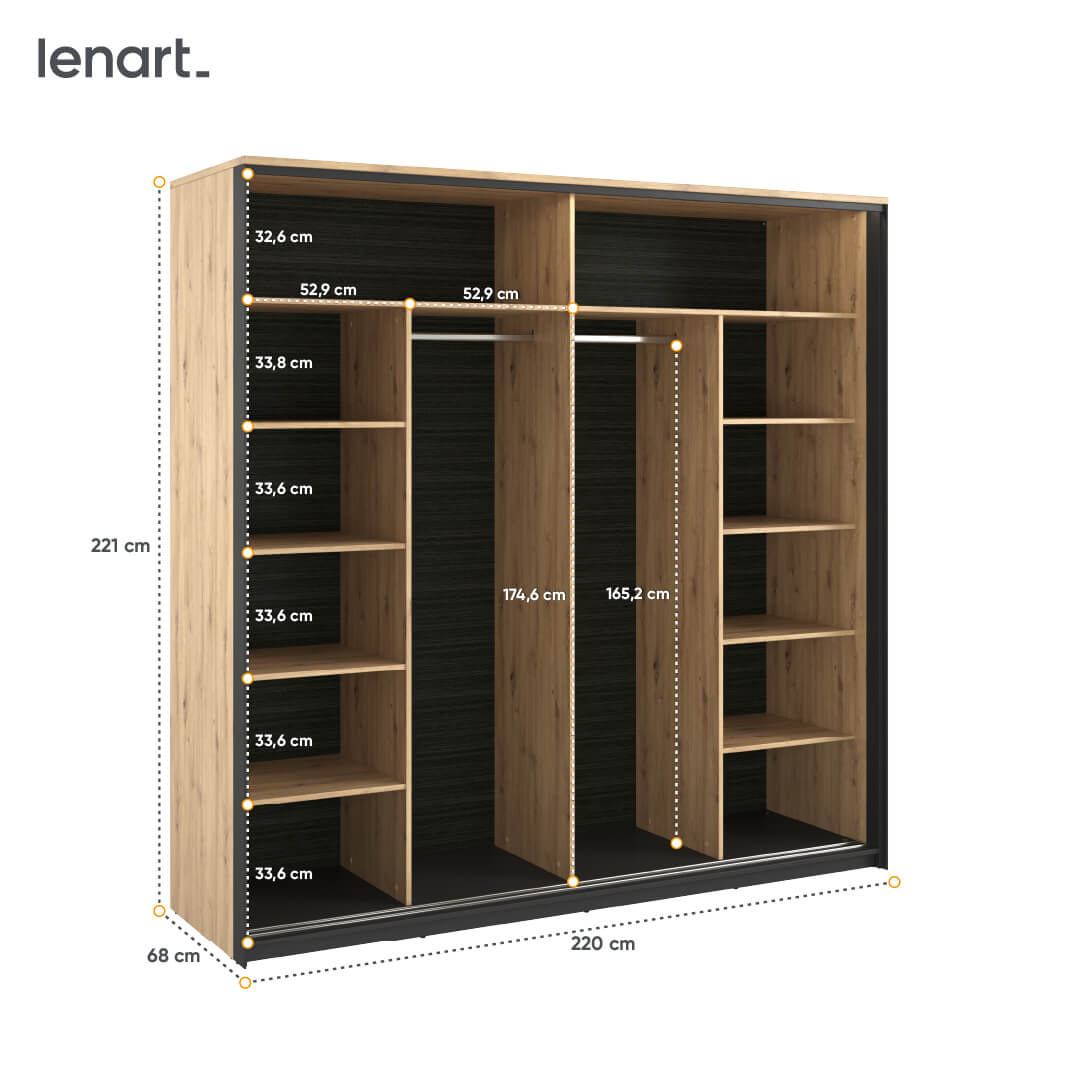 Wymiary szafy QUANT QS-01 robią wrażenie: szerokość wynosi aż 220 cm, wysokość to 221 cm, a głębokość - 68 cm, co świadczy o niezwykle obszernej przestrzeni na Twoją garderobę. Oprócz imponującej pojemności, szafa waży 223 kg, co jest potwierdzeniem jej stabilności i solidności wykonania. Została zbudowana z wysokiej jakości płyt wiórowych laminowanych, o grubości 16 mm dla korpusu i 22 mm dla blatu, zapewniając trwałość na lata.