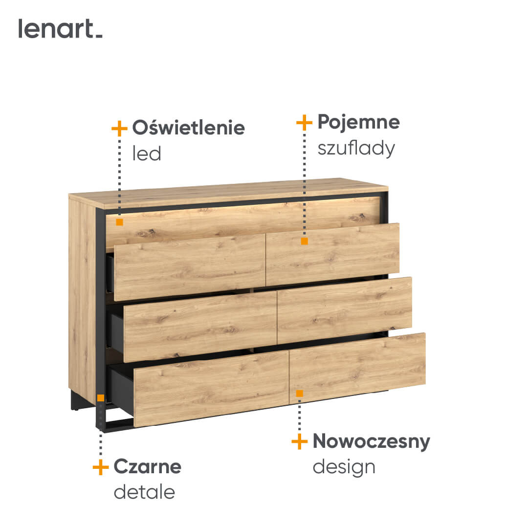 - Komoda QUANT QS-04 wyróżnia się loftowym designem z akcentem industrialnym, oferując 3 pojemne szuflady i nowoczesne oświetlenie LED w zestawie. Idealna do nowatorskich aranżacji sypialni.