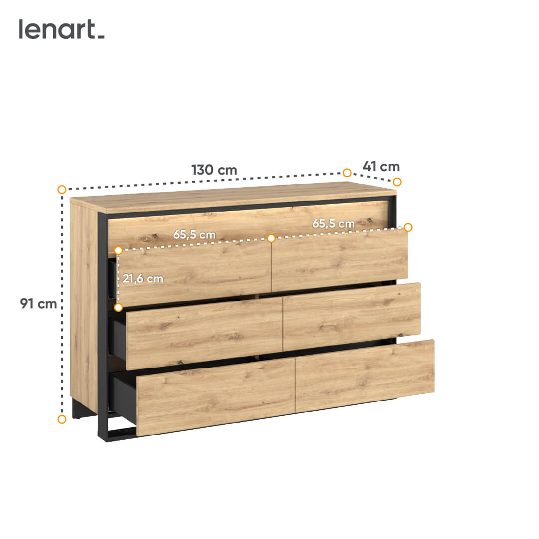 Z należytą precyzją i dbałością o szczegóły stworzona została ta wyjątkowa bryła QS-04 z kolekcji QUANT. Elegancka kolorystyka dąb artisan spotyka się z głębokim czernią, nadając meblowi wyrafinowany i nowoczesny charakter. Szerokość komody wynosi 130 cm, wysokość 91 cm, a głębokość 41 cm, co czyni ją idealnym wyborem do wyposażenia przestrzeni sypialnianej oraz pokoju dziennego.