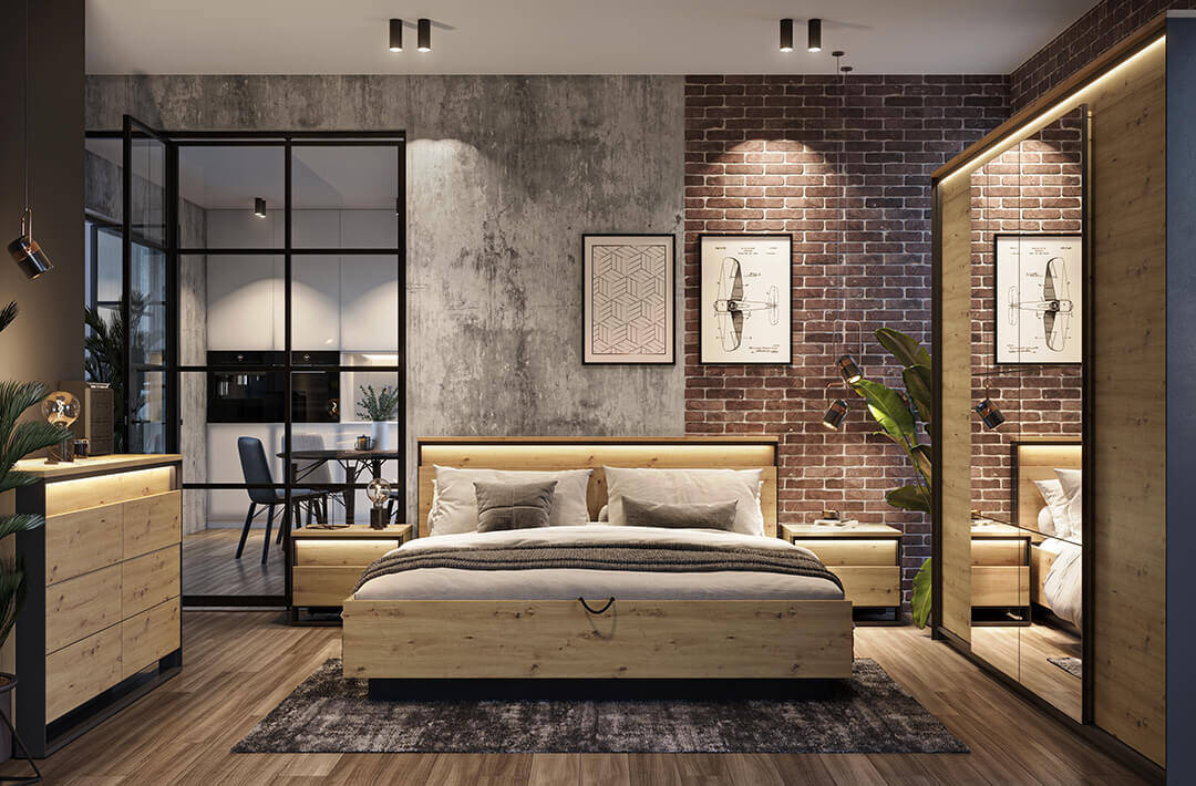 Unikalny akcent to LED-owe oświetlenie w komplecie, które nie tylko podkreśla wyjątkowość mebla, ale również tworzy atmosferę w komnacie wypoczynkowej. Energooszczędna taśma LED o klasie energetycznej A++ dostarcza subtelne oświetlenie, które perfekcyjnie uzupełnia styl loftowy mebla.