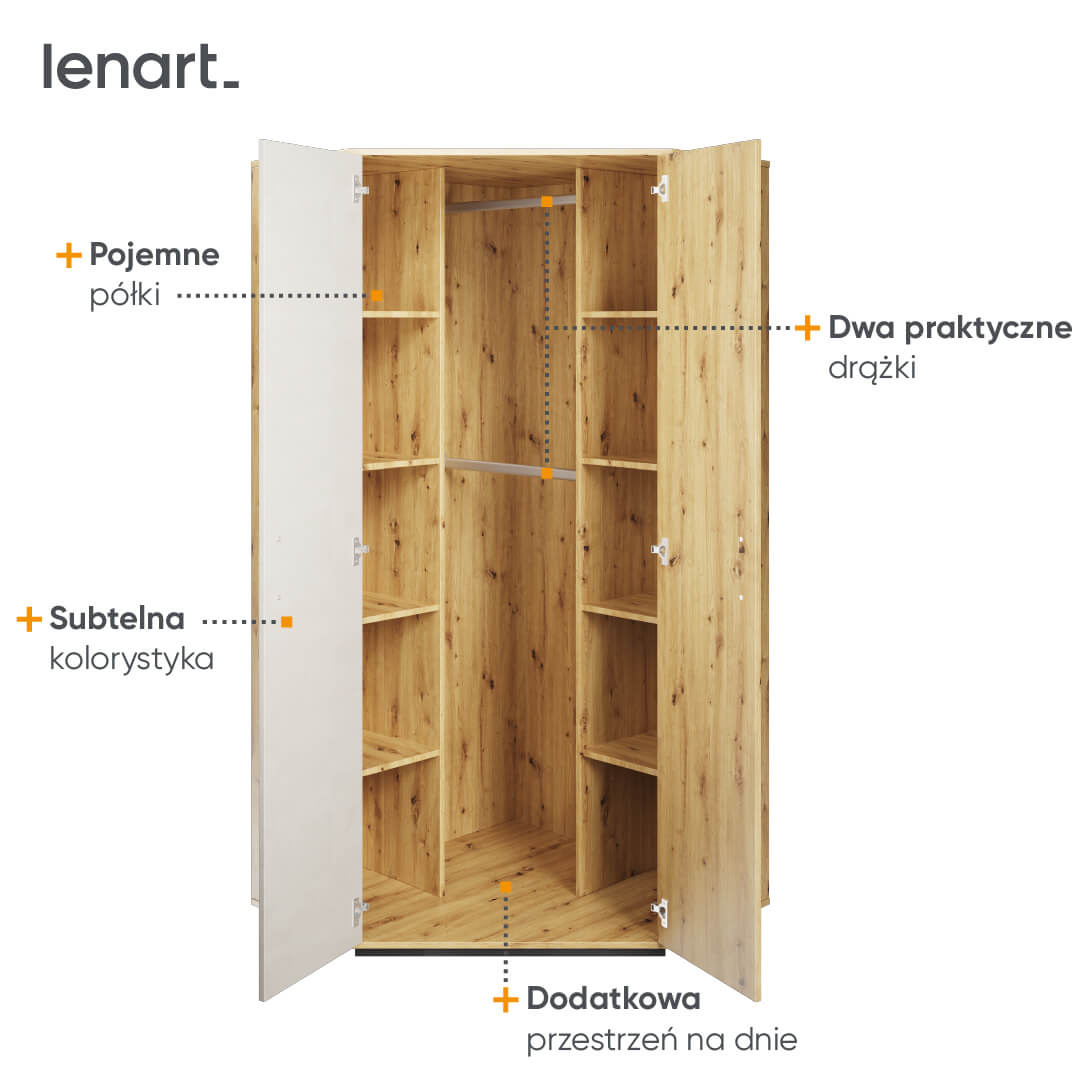 Wnętrze szafy jest przemyślane i przestrzenne – wyposażone w dwa drążki na ubrania oraz osiem półek o maksymalnym obciążeniu 5 kg na każdą. Jest to idealne rozwiązanie dla osób, które cenią sobie porządek i łatwy dostęp do wszystkich elementów swojej garderoby.