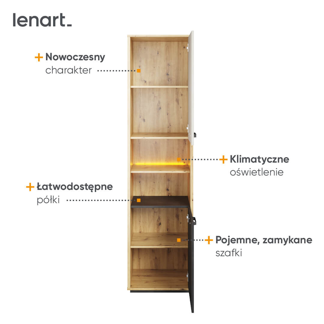 Największym atutem regału jest zintegrowane oświetlenie LED, które tworzy przytulną atmosferę i pozwala eksponować wybrane elementy wewnątrz szafy. Taśmy LED nie tylko dodają uroku, ale również są energooszczędne i łatwe w obsłudze.