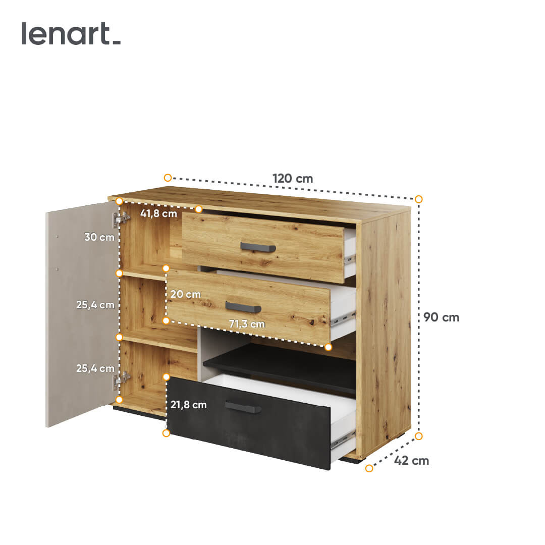 Oferując wymiary 120 cm szerokości, 90 cm wysokości oraz 42 cm głębokości, komoda QB-07 dostarcza przestrzeni nie tylko dzięki trzem szufladom o głębokości 3 mm na bieliznę i drobne ubrania, ale również dzięki szafce z drzwiami i dodatkowej, otwartej wnęce. Płyta wiórowa laminowana o grubościach 16 i 22 mm, z którego wykonany został korpus, zapewnia trwałość i długotrwałe użytkowanie, natomiast wytrzymałe obrzeża ABS gwarantują odporność na codzienne użytkowanie.