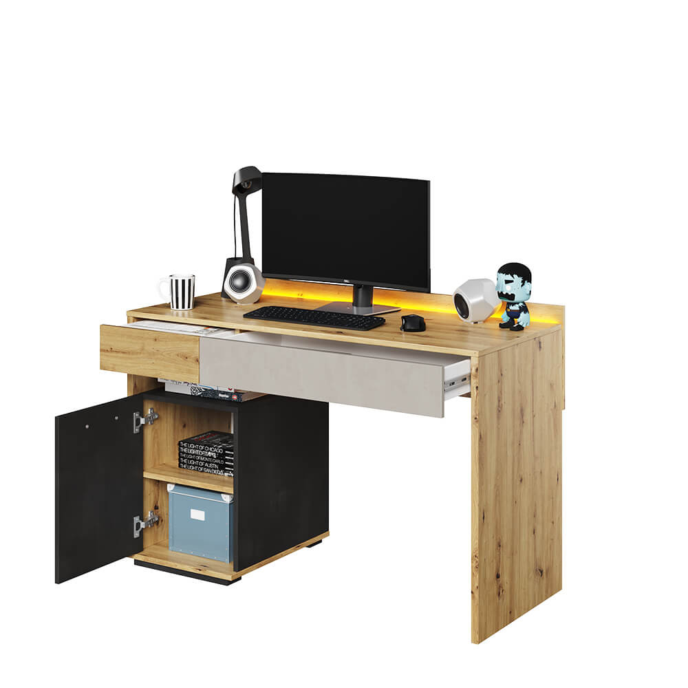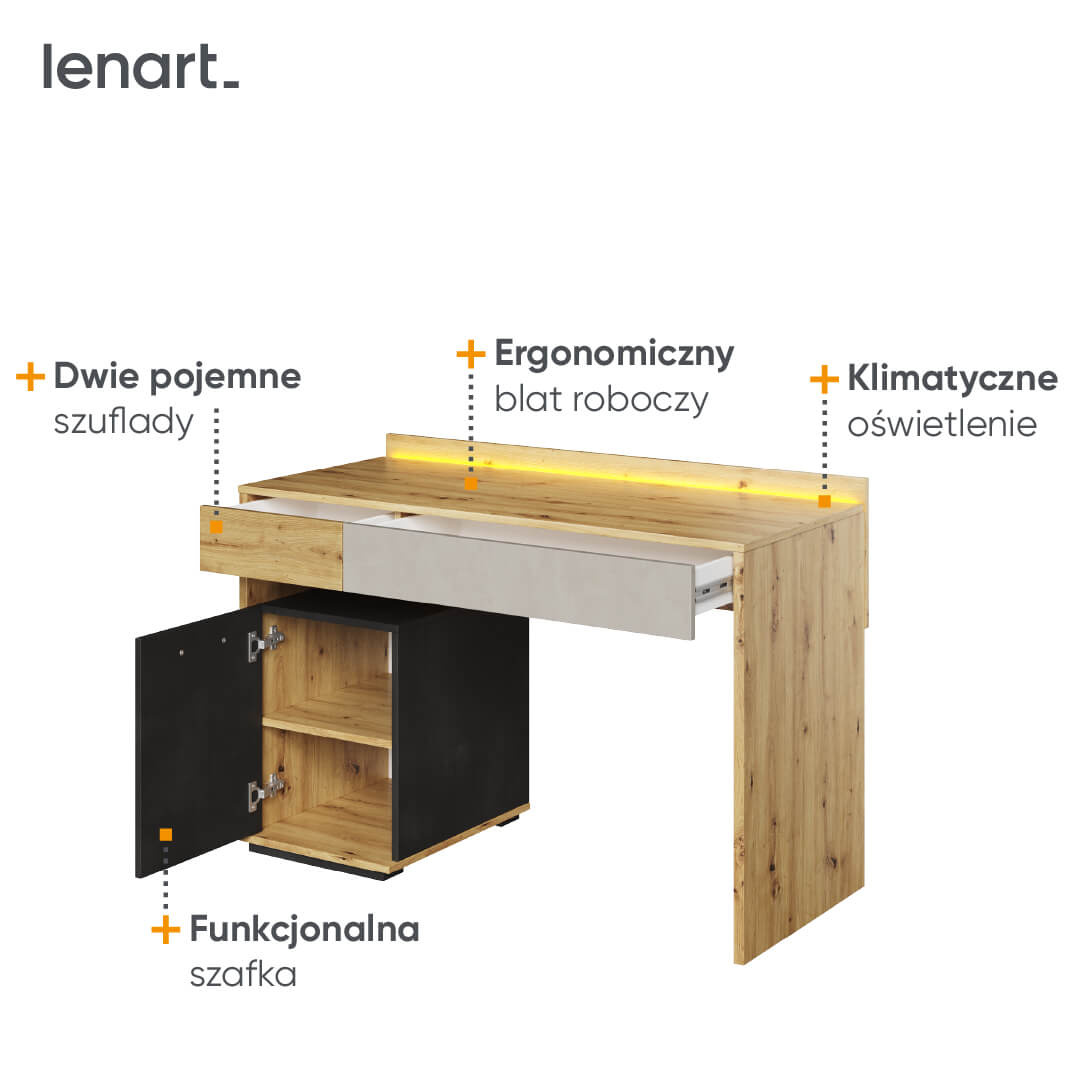 • Biurko QUBIC QB-08 łączy styl i funkcjonalność; przestronny blat z oświetleniem LED, dwie szuflady i szafka, wszystko w eleganckiej kolorystyce dąb artisan/raw steel/silk flou. Nowoczesne wykończenie dla efektywnej pracy.