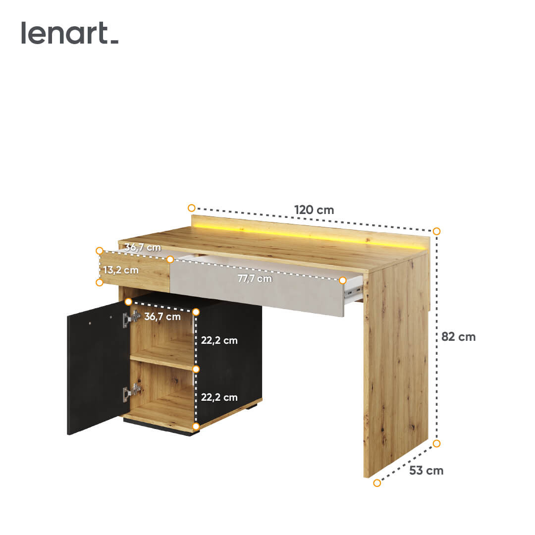 Ergonomiczność biurka objawia się w jego rozmiarach – szerokość 120 cm, wysokość 82 cm oraz głębokość 53 cm pozwala na wygodne rozmieszczenie wszelkich niezbędnych akcesoriów biurowych. Dodatkowym atutem jest oświetlenie w postaci taśmy LED, która zapewnia odpowiednie warunki oświetleniowe podczas pracy o każdej porze dnia i dodaje biurku wyjątkowego charakteru.