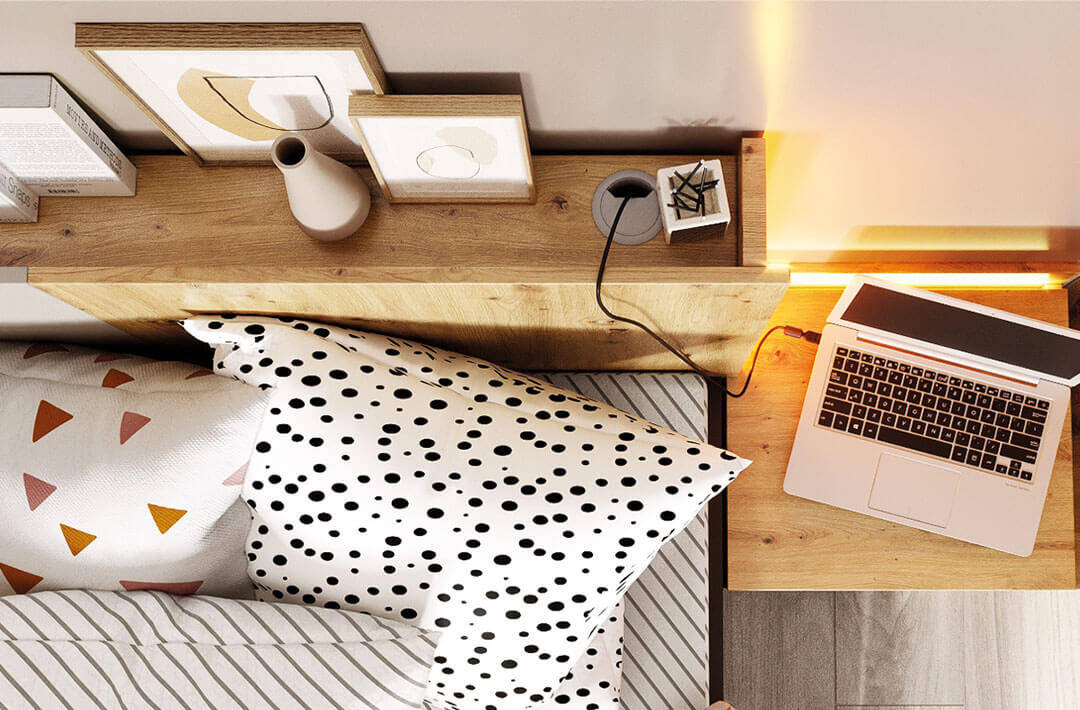 Niezaprzeczalną zaletą mebla jest jego bogate wyposażenie, które obejmuje dwie szuflady na pościel po bokach łóżka, praktyczną półkę w zagłówku oraz nowoczesne oświetlenie LED. Wysoki zagłówek nie tylko oferuje komfortowe oparcie, ale również został wyposażony w otwory na kable, dzięki czemu możesz łatwo zarządzać przewodami, np. od ładowarki. To propozycja, która łączy w sobie praktyczność i wyrafinowany wygląd.