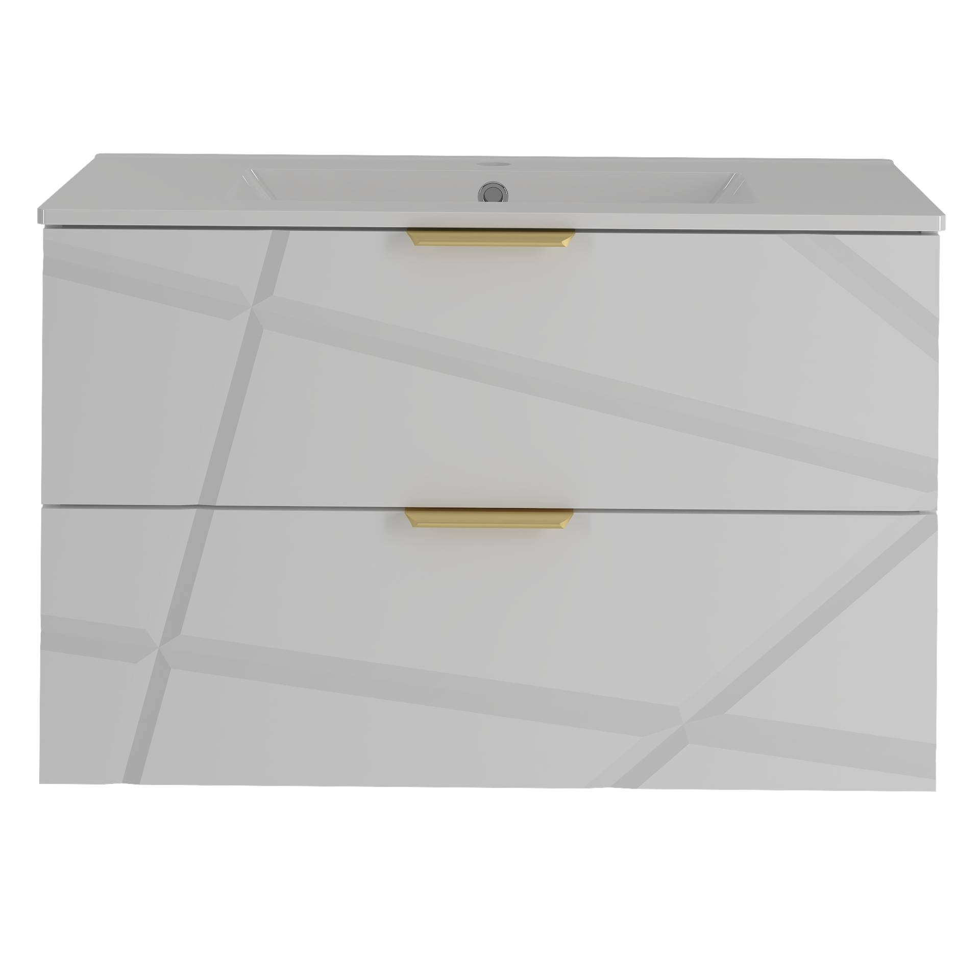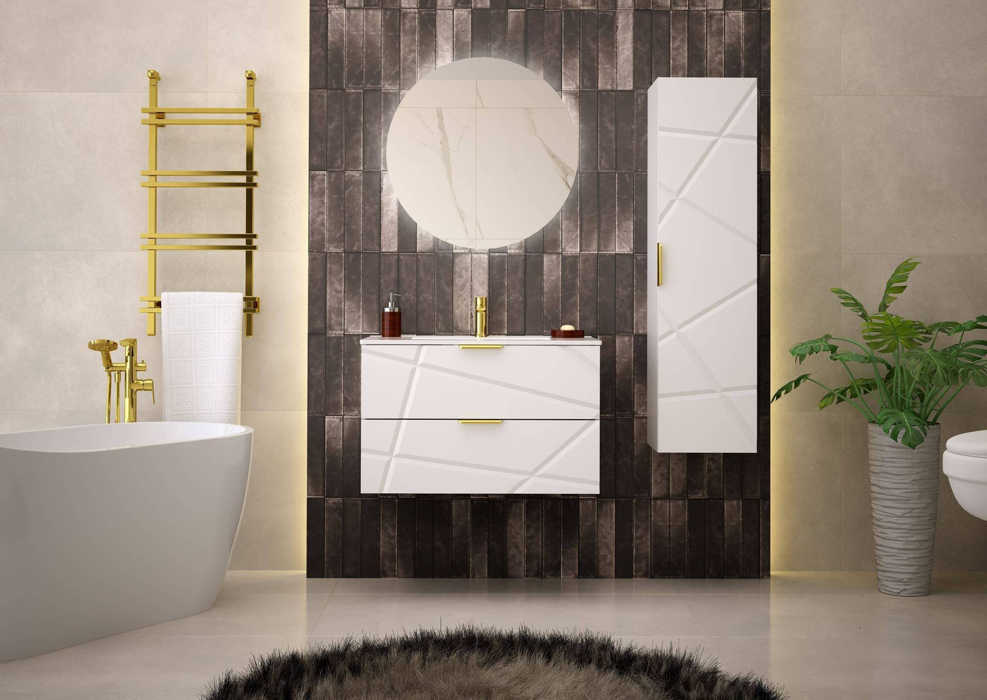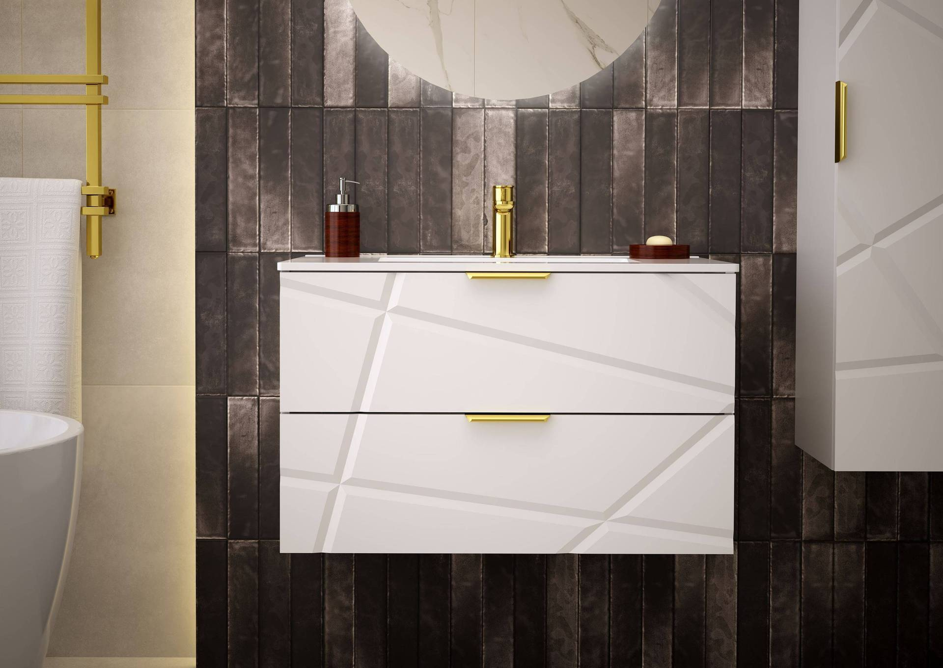 Szafka z umywalką RADOM-06 łączy nowoczesny styl z funkcjonalnością. Wykonana z płyty MDF i laminowanej, w eleganckim białym macie. Metalowe złote uchwyty dodają szyku. Ceramika sanitarna o błyszczącym wykończeniu. Prowadnice z cichym domykiem.