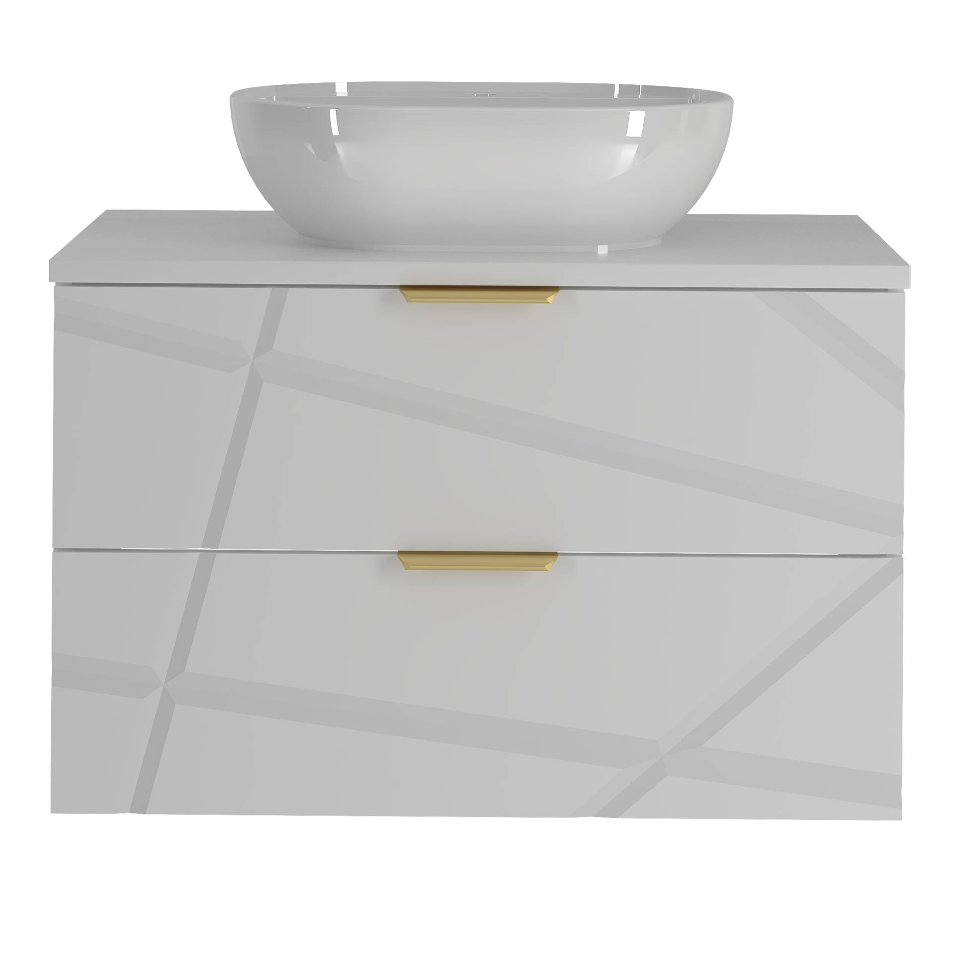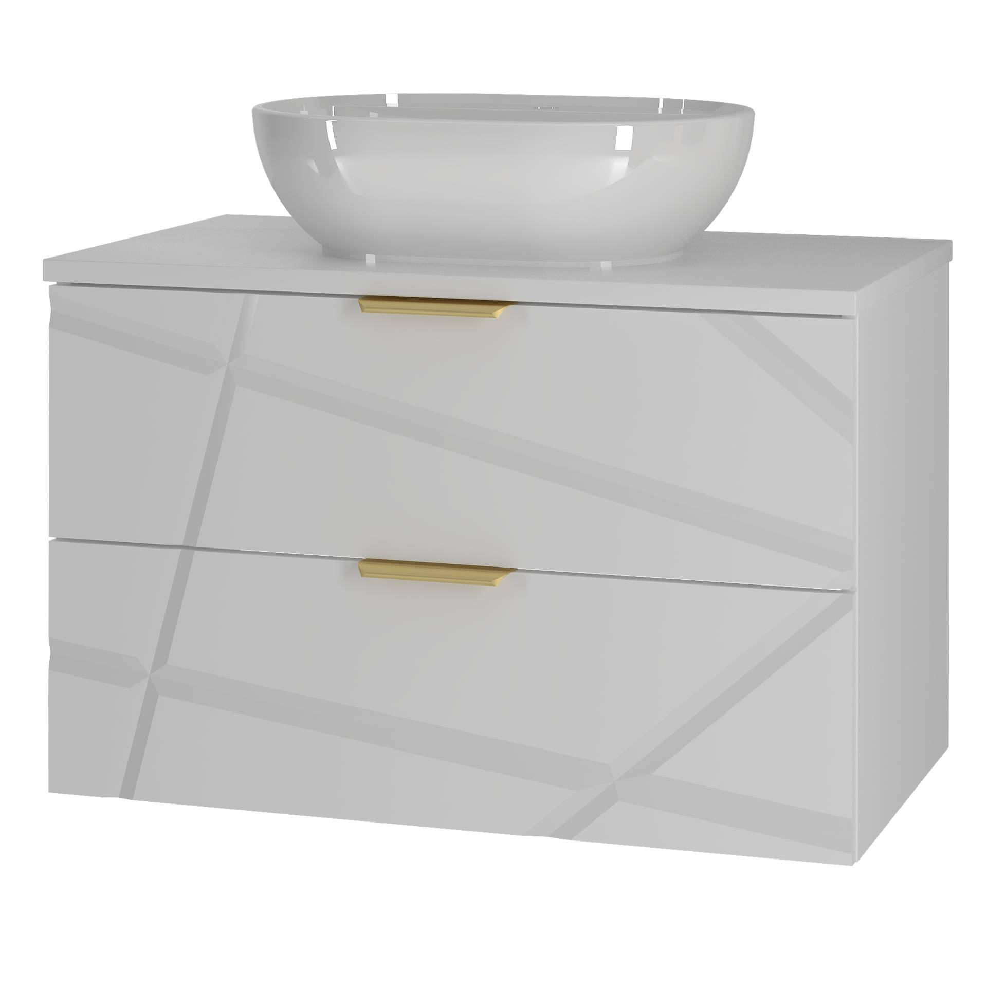Stylowa szafka łazienkowa RADOM-06 z umywalką nablatową i blatem, wykonana z płyty MDF w białym macie. Cichy domyk zapewnia wygodę, a metalowe uchwyty w kolorze złotym dodają elegancji. Blat z ceramiką sanitarną w zestawie. Idealna do nowoczesnych wnętrz.