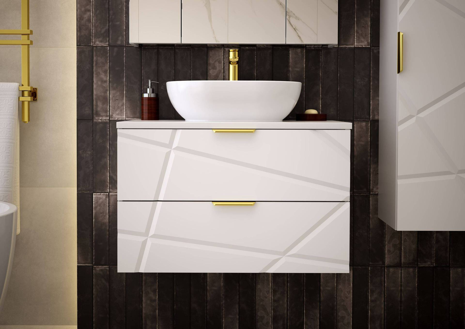 - Stylowa szafka łazienkowa RADOM-06 z umywalką nablatową i blatem, wykonana z płyty MDF w białym macie. Cichy domyk zapewnia wygodę, a metalowe uchwyty w kolorze złotym dodają elegancji. Blat z ceramiką sanitarną w zestawie. Idealna do nowoczesnych wnętrz.