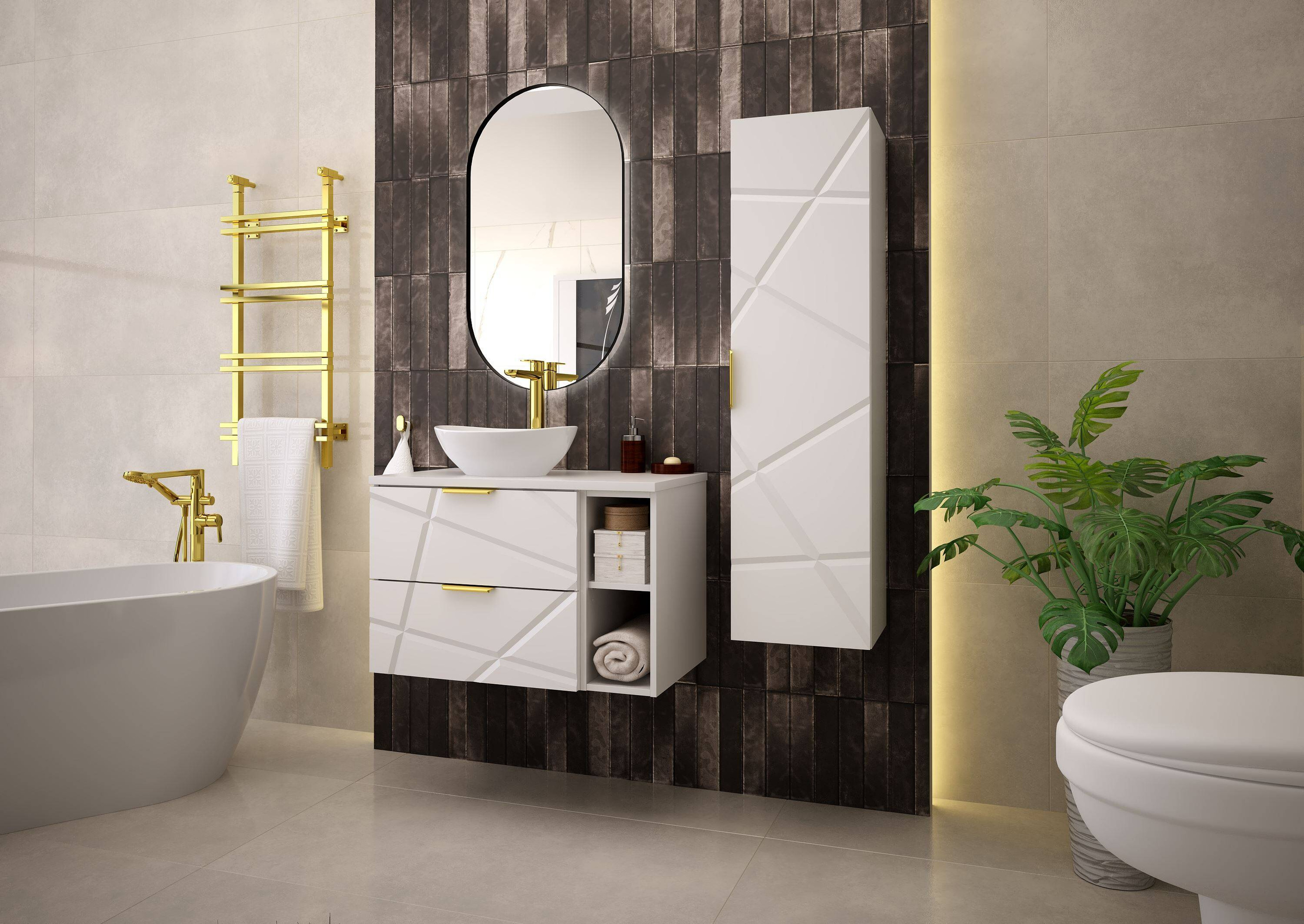 Odkryj piękno i funkcjonalność w jednym zaskakującym zestawie – Szafka pod Umywalkę RADOM-07 od Megstyl. Stanowi ona kwintesencję nowoczesnego designu, której nie sposób się oprzeć. Śnieżnobiały mat w połączeniu ze złotymi uchwytami tworzy eleganckie i jednocześnie subtelne połączenie doskonałe do każdej łazienki. Każdy szczegół został starannie zaprojektowany, aby wprowadzić do wnętrza ducha luksusu i stylu.