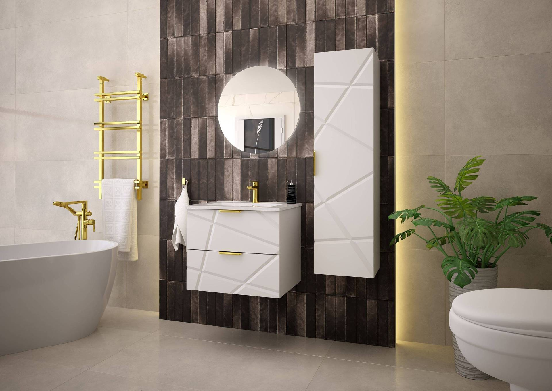 Contour białego matowego blatu nadaje nowoczesnego charakteru i doskonale komponuje się z złotymi uchwytami, które stanowią subtelną nutę luksusu. Ten wyszukany detal przyciąga wzrok i podkreśla dbałość o szczegóły w wykonaniu zestawu. Jego uniwersalny kolor sprawia, że łatwo dopasować go do innych elementów łazienki, tworząc spójną i harmonijną aranżację.