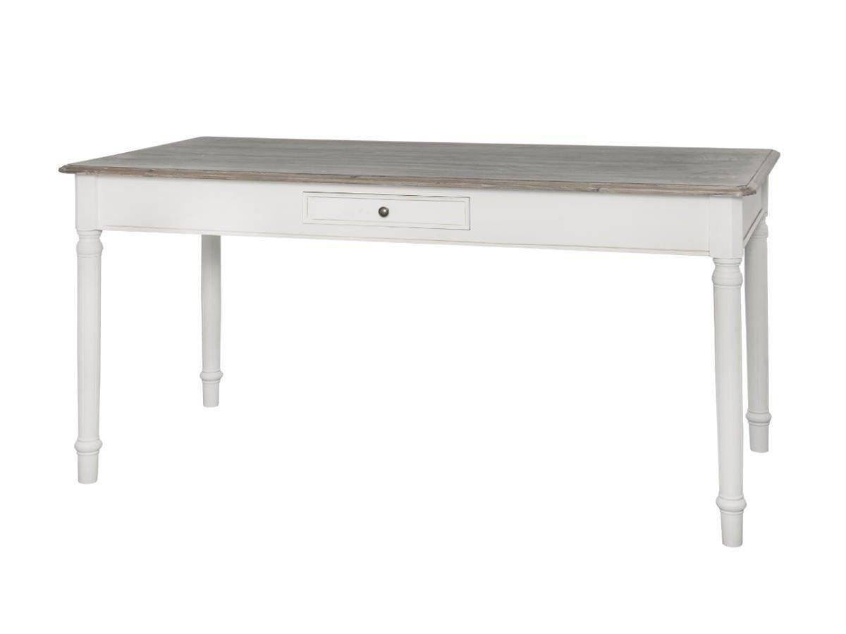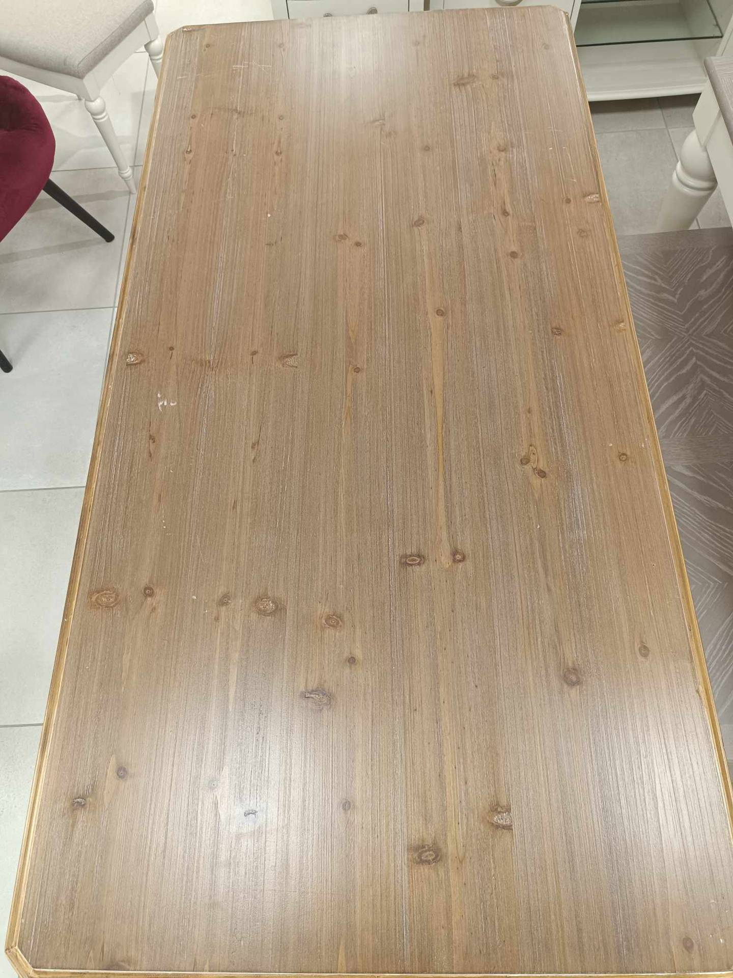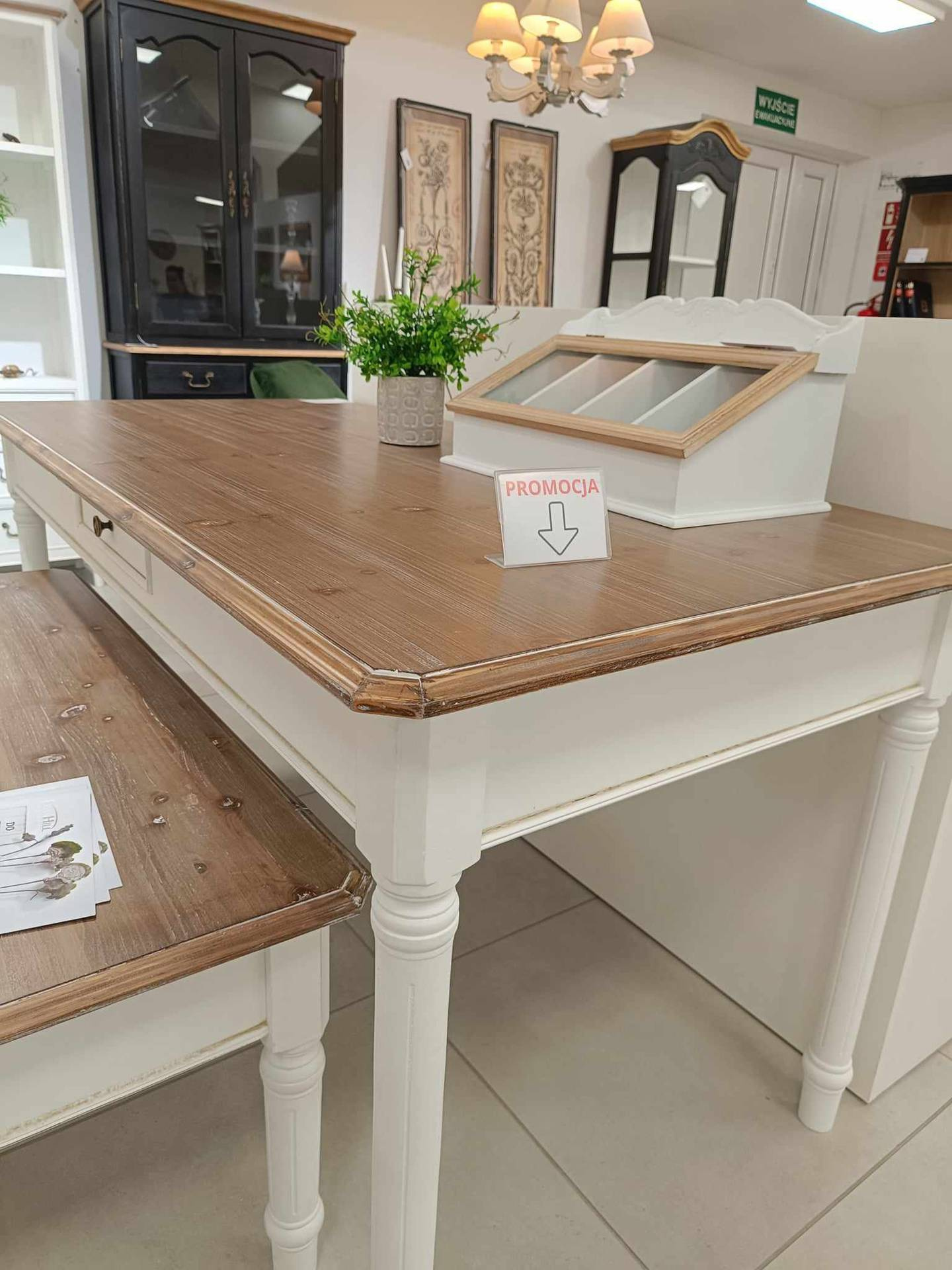 - Piękny stylizowany biały stół z brązowym bielonym blatem i szufladką. Klasyczny kształt i prosta elegancka forma.