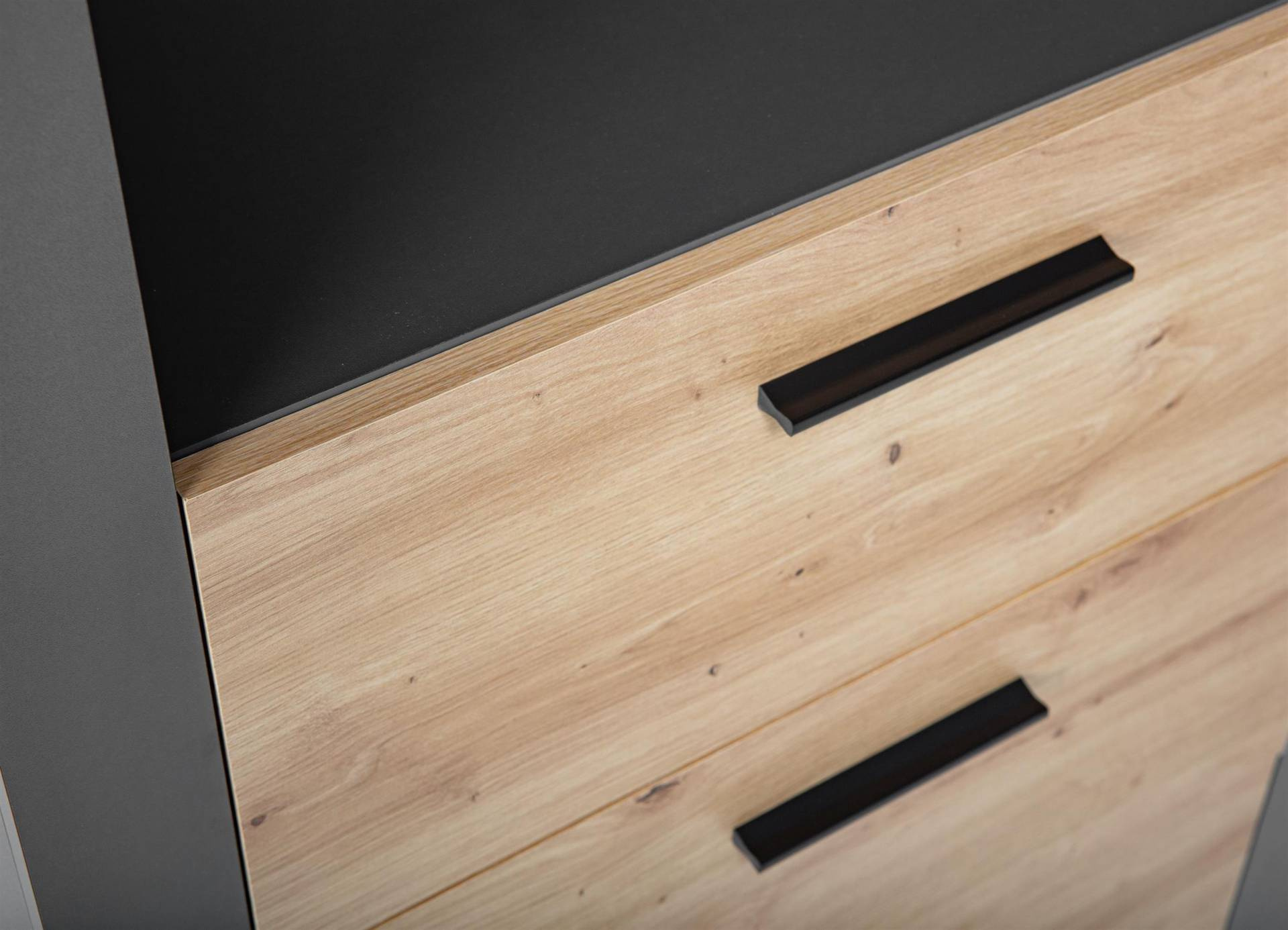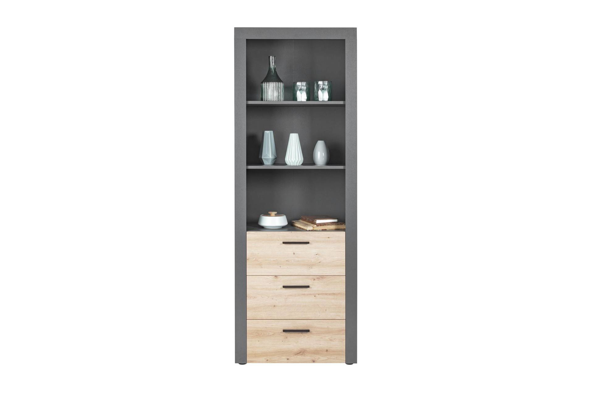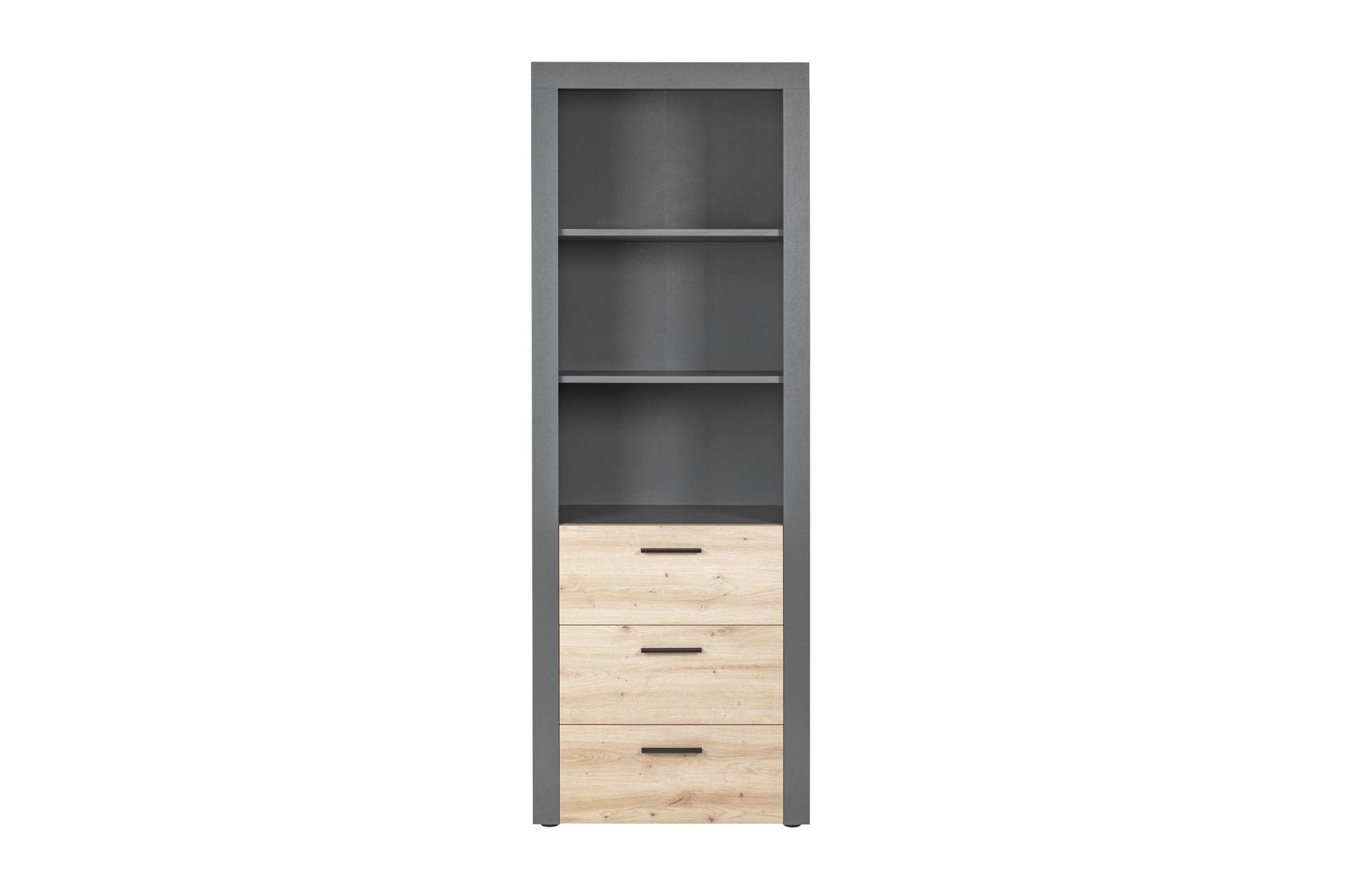 - Stojący regał z dwiema półkami i trzema pojemnymi szufladami z naturalnego drewna w kolorze antracytowym.