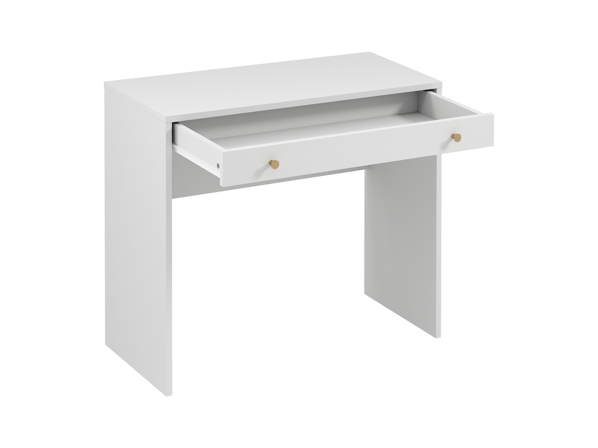 Znajdująca się w zestawie jedna szuflada to właśnie to, czego potrzebujesz, aby zorganizować swoje miejsce pracy. Dzięki praktycznemu designowi, wszystko, co ważne, będzie zawsze pod ręką i na wyciągnięcie ręki. Nieprzypadkowo postawiono tu na uchwyty w złotym kolorze, które dodają elegancji i subtelnego blasku, tworząc przyjemny kontrast z białą powierzchnią biurka.