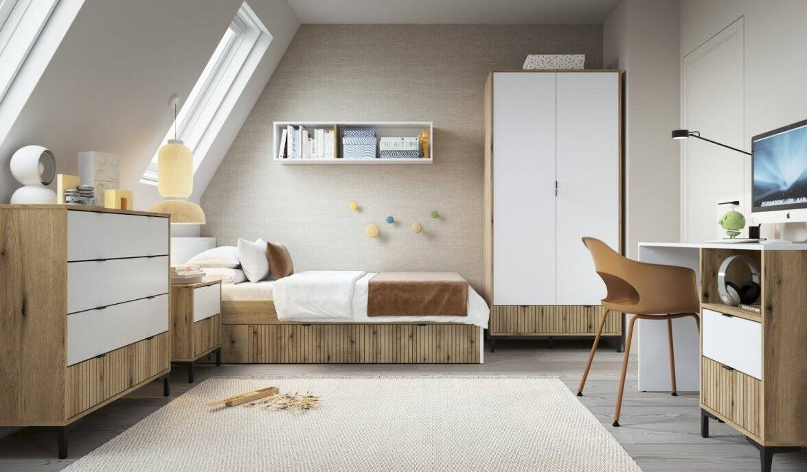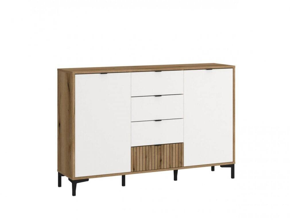 - Komoda Ricko RIKK05 łączy funkcjonalność z eleganckim designem - posiada 4 szuflady oraz drzwi, kryjące przestronne półki. Wykonana w kolorze Dąb Coast Evoke z białymi frontami, świetnie wkomponuje się w różnorodne wnętrza.