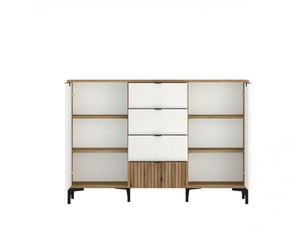 Wyróżniająca się elegancją, mebel został wykonany z wysokiej jakości płyty laminowanej, co gwarantuje jego trwałość i odporność na uszkodzenia. Korpus prezentuje się w odcieniu naturalnego dębu, natomiast fronty zostały zaprojektowane w bieli, co rozświetla przestrzeń i dodaje świeżości wnętrzu. Ultranowoczesne są również detalami takimi jak minimalistyczne uchwyty czy stylowe nóżki wykonane z tworzywa sztucznego, które uzupełniają całość kompozycji, nadając jej lekkości i modernistycznego charakteru.