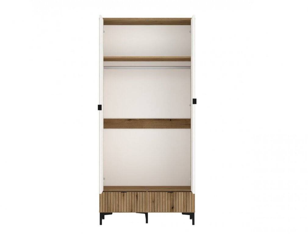 Szafa dwudrzwiowa Ricko RIKS01 łączy nowoczesny design z funkcjonalnością, oferując szeroki drążek, pojemną półkę oraz szufladę na akcesoria. Biel połączona z odcieniem drewna i ryflowanym frontem szuflady, doda elegancji każdemu wnętrzu.