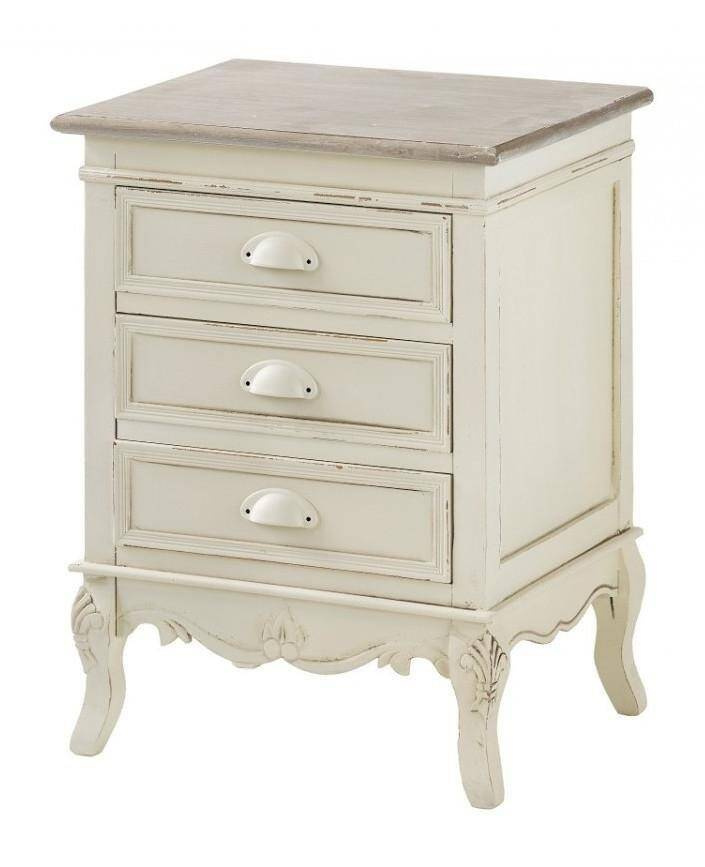 Szafka nocna Rimini 013 podkreśli charakter stylowej sypialni, ale sprawdzi się także jako niewielka komoda w innym pomieszczeniu. Wyposażony w trzy szuflady mebel opiera się na pięknie giętych i rzeźbionych nóżkach, które wyglądają niezwykle elegancko. Całość utrzymano w kremowej kolorystyce, a blat jest szarobrązowy, co tworzy elegancką całość. Delikatne postarzenie nawiązuje do modnego nurtu shabby chic.