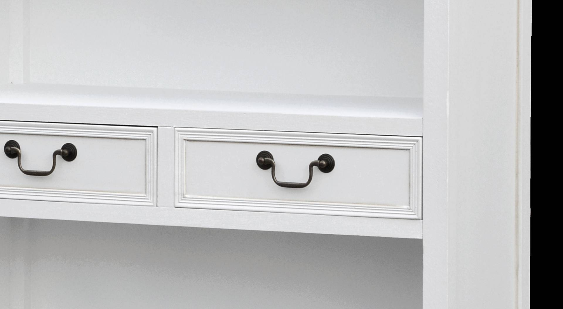 - Wyjątkowy regał biblioteczka o szerokości 90 cm z dwiema szufladami i dwiema półkami. Mebel posiada przetarcia w stylu shabby chic i wieniec w kolorze ciemnobrązowym.