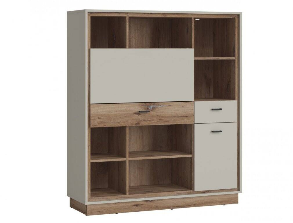 • Rivero RIVB02 to wielofunkcyjny regał z ukrytym, składanym blatem biurka, idealny do małych przestrzeni. Wykończony w odcieniach Dąb Flagstaff Ciemny i Szary Krzemowy, charakteryzuje się nowoczesnym designem i cichym domykiem.