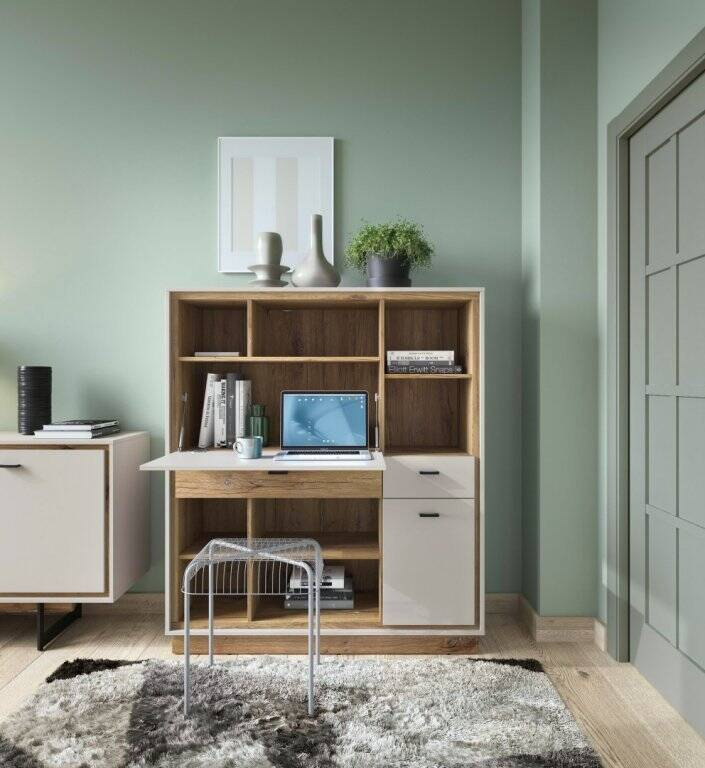 Co wyróżnia regał Rivero na tle innych mebli? To nie tylko miejsce na książki czy ozdoby. To również funkcjonalne biurko, które w razie potrzeby można rozłożyć, tworząc ergonomiczne stanowisko pracy. Kiedy praca dobiegnie końca, blat można łatwo schować, nie zajmując cennego miejsca w pokoju.