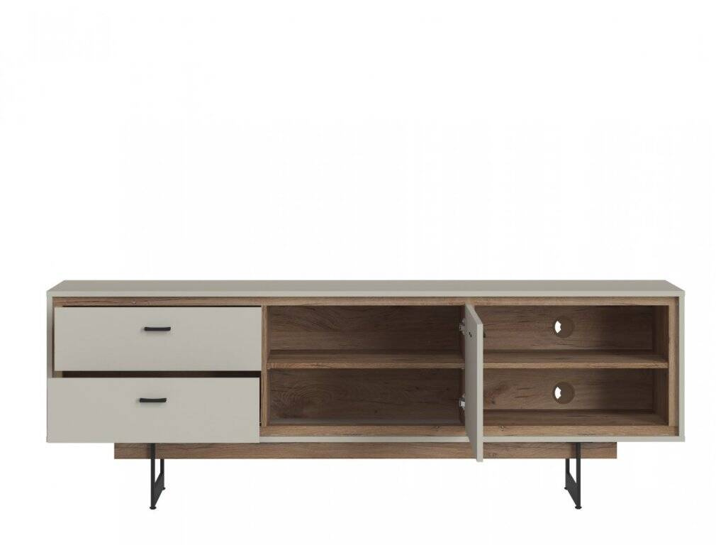 Estetyczny stelaż metalowy nadaje meblowi lekkość i wpisuje się w industrialne oraz nowoczesne klimaty. Dwie szuflady, każda z systemem cichego domyku, umożliwiają dyskretną organizację akcesoriów, natomiast otwarte półki są idealnym miejscem na dekodery, konsole czy odtwarzacze. Komoda została wyposażona w praktyczne otwory na przewody, co ułatwia zachowanie porządku i estetycznego wyglądu całego zestawu RTV.
