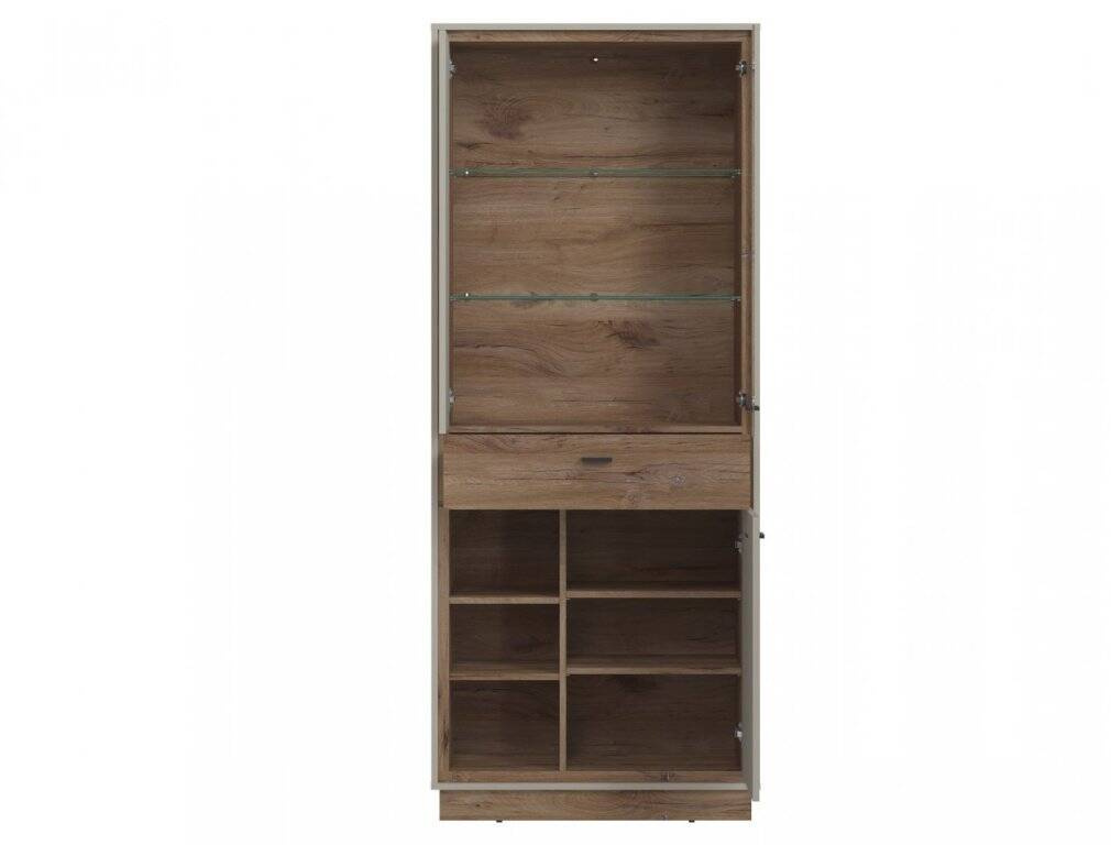 Witryna Rivero RIVV05 o asymetrycznym designie łączy nowoczesność i funkcjonalność. Eleganckie wykończenie w kolorach Szary Krzemowy i Dąb Flagstaff, metalowe uchwyty oraz opcjonalne oświetlenie LED.