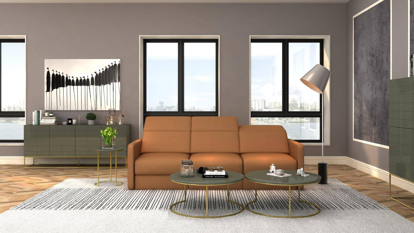 - Stolik kawowy o szerokości 80 cm z płyty MDF w kolorze cementowej zieleni w stylu nowoczesnym, modern classic, modern glamour. Podstawa z metalu w kolorze złotym.