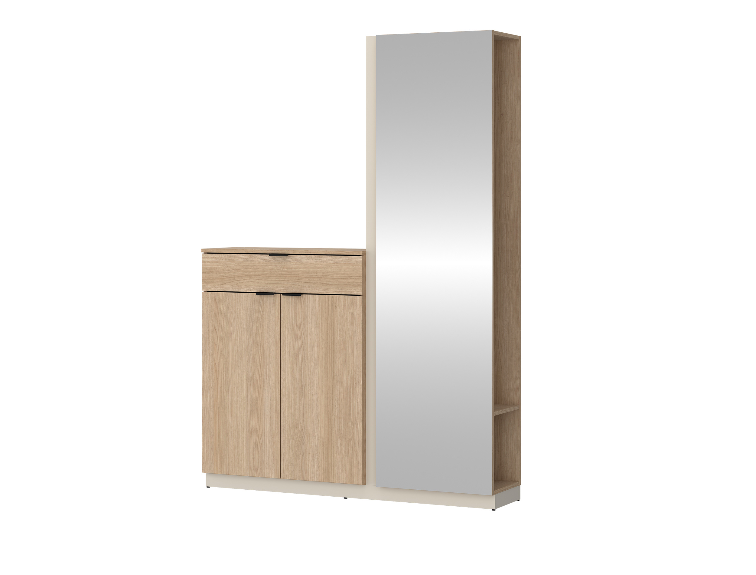 Garderoba Sanya SAYGG2 to eleganckie połączenie funkcjonalności i stylu. W kolorze kaszmiru z naturalnym dekorem dębu Cremona, oferuje solidne wieszaki, lustro oraz praktyczne szuflady i szafki.