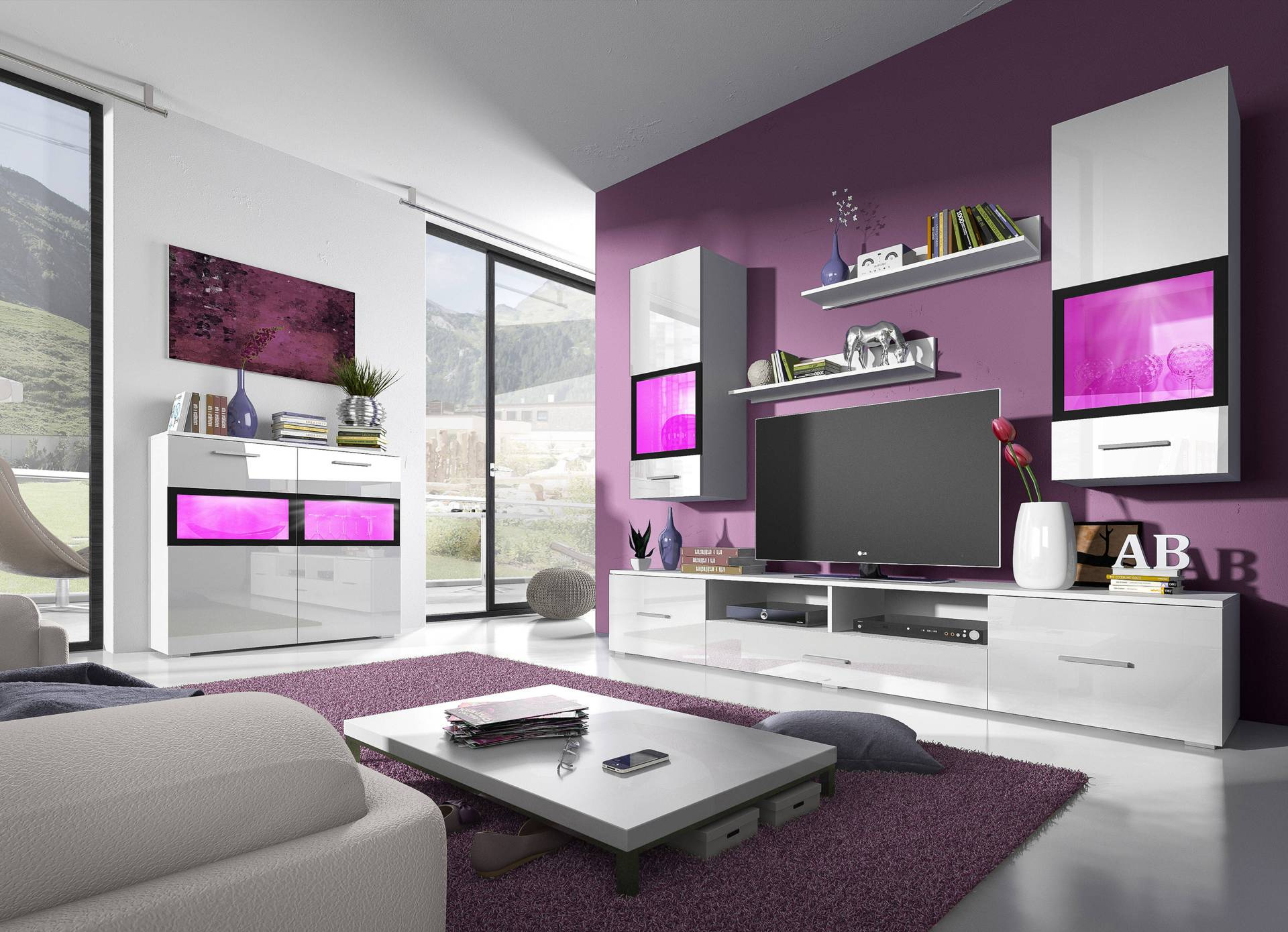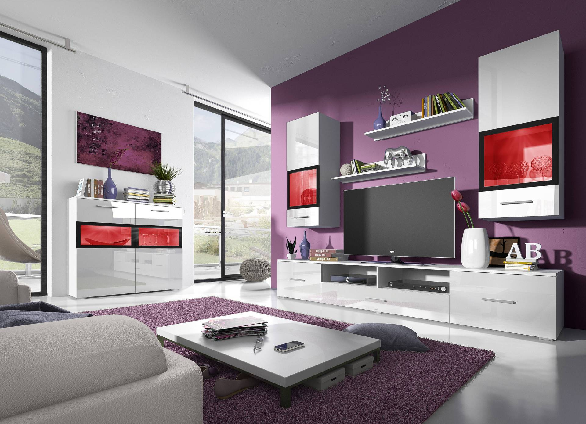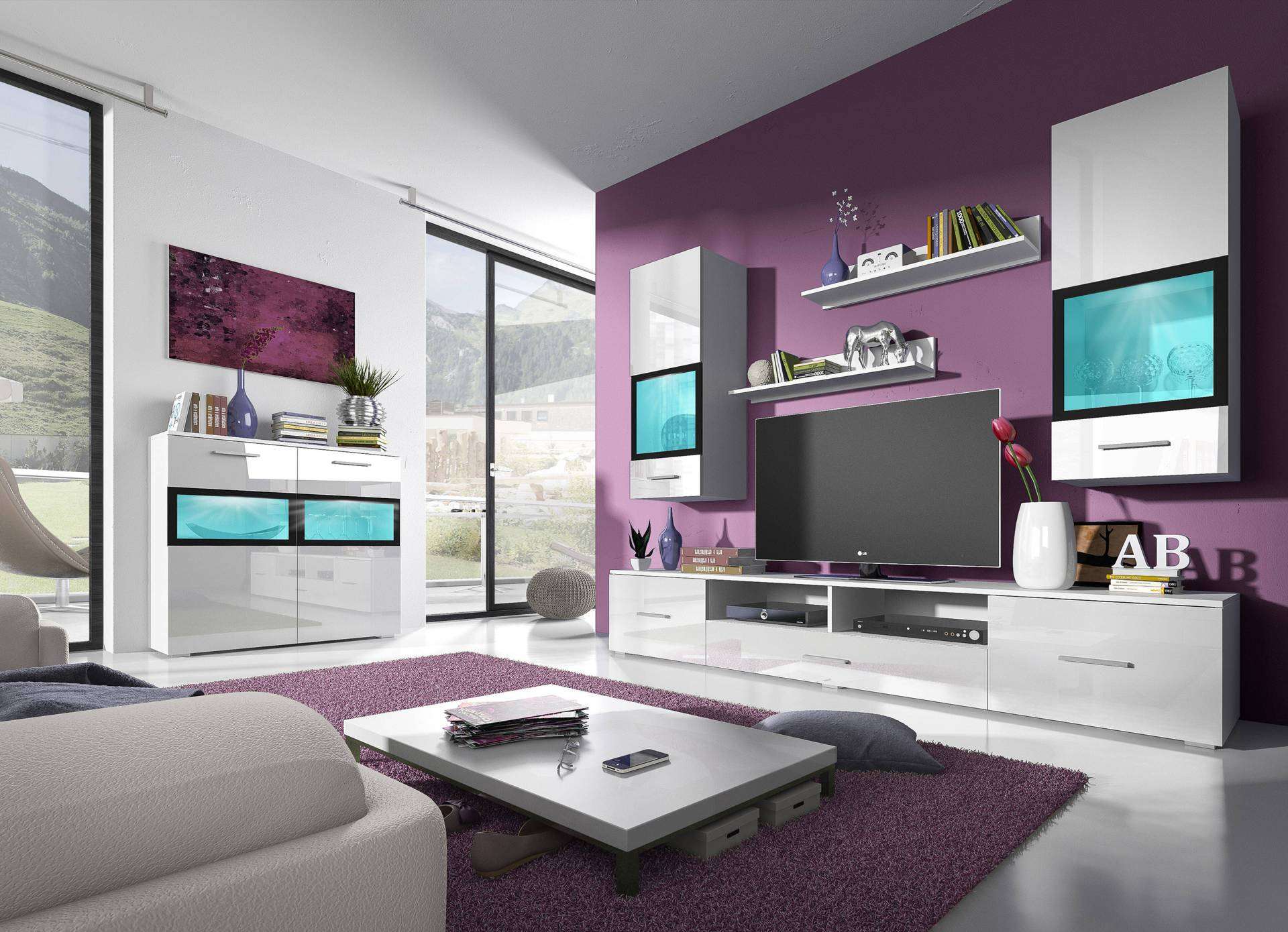 - Elegancka meblościanka Sarah w połyskującym białym laminacie z czarnymi detalami. Wyposażona w kontrastowe szklane witryny i opcjonalne RGB LED, które dodadzą wnętrzu nowoczesnego charakteru.