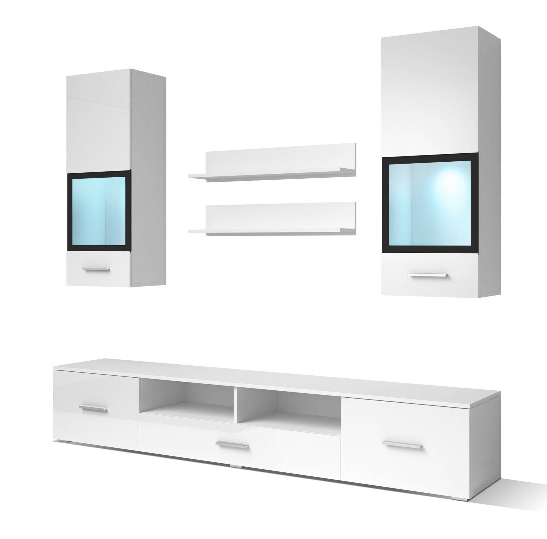 Elegancka meblościanka Sarah w połyskującym białym laminacie z czarnymi detalami. Wyposażona w kontrastowe szklane witryny i opcjonalne RGB LED, które dodadzą wnętrzu nowoczesnego charakteru.