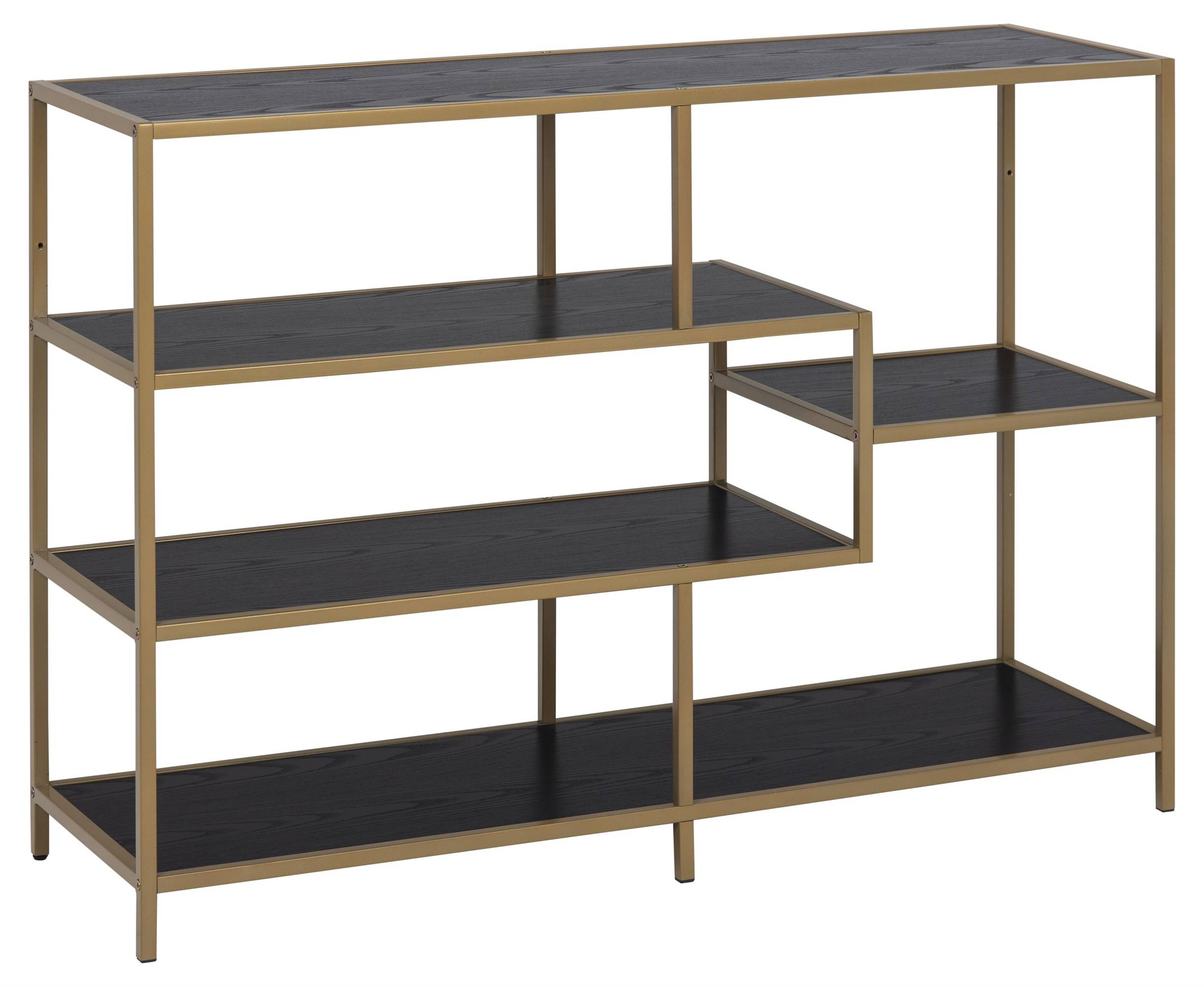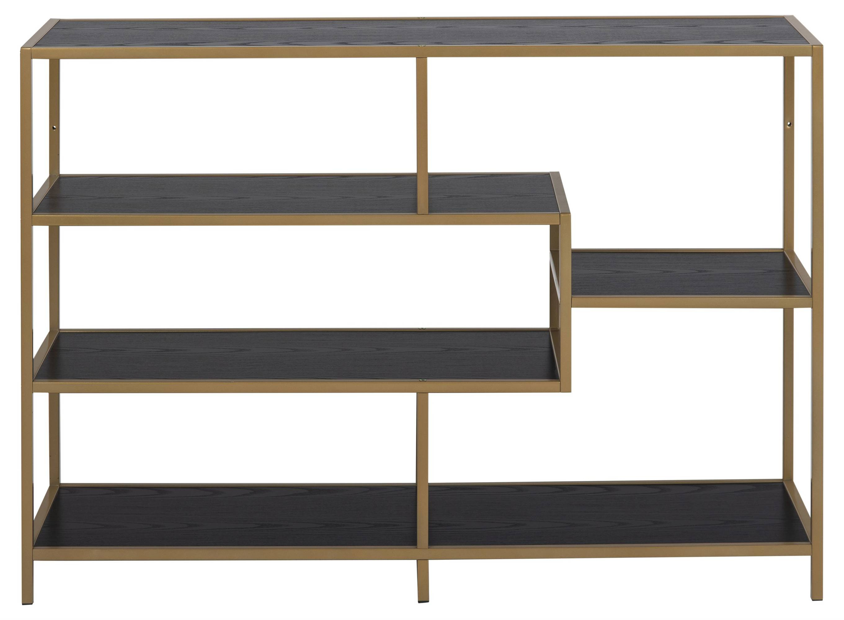 - Regał Seaford, metal malowany proszkowo na kolor złoty, 4 półki z czarnej jesionowej melaminy, Asymetryczny, 114x35x78 cm