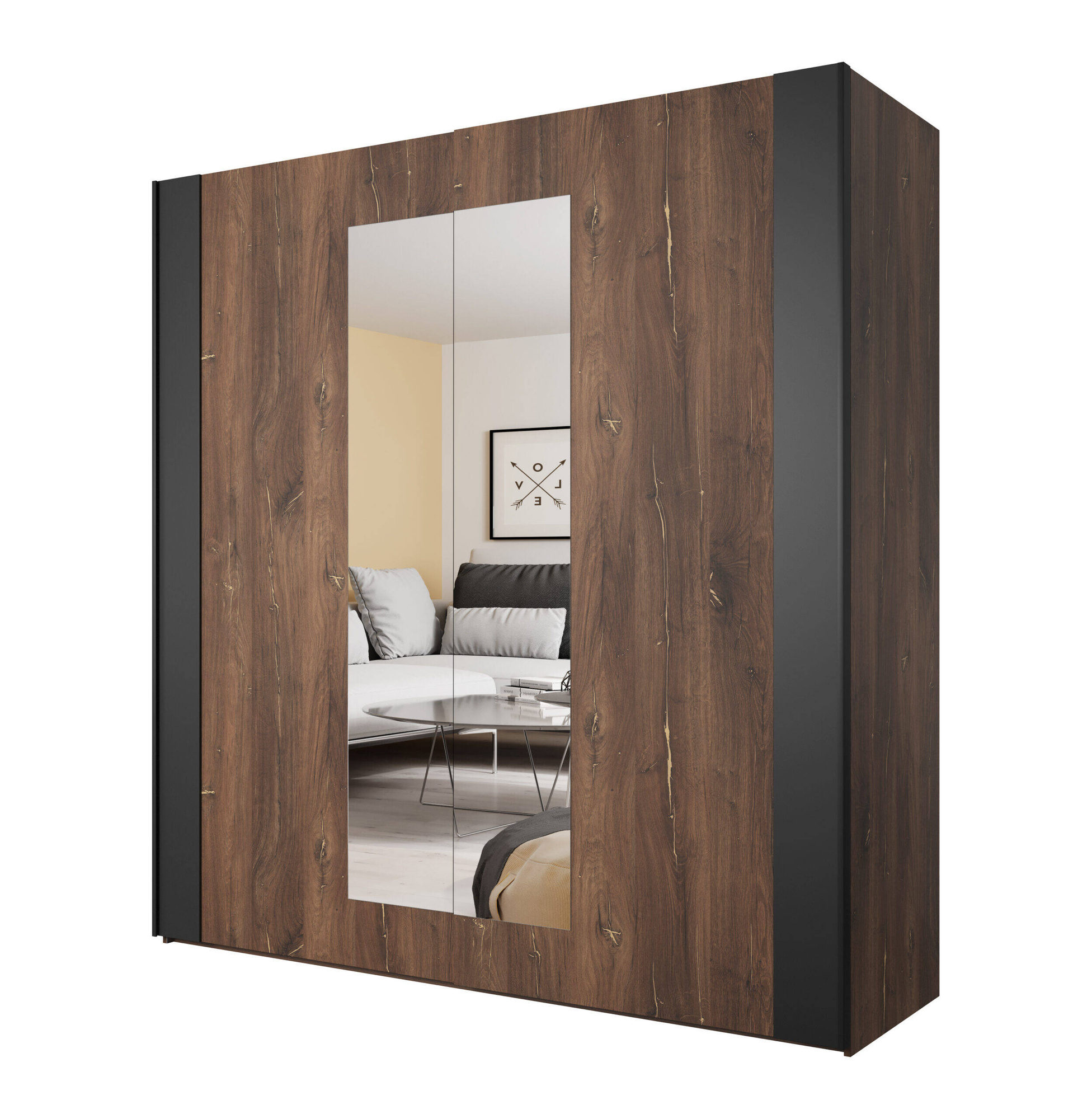 Ta dwudrzwiowa konstrukcja z efektownymi frontami łączącymi klasyczny dąb z nowoczesnym czarnym matem, wyposażona jest w praktyczne drzwi przesuwne z lustrami, które optycznie powiększą każde pomieszczenie i dodadzą mu splendoru. Dzięki dwóm drążkom ubraniowym, rozmieszczonym po jednym z każdej strony, oraz praktycznym półkom nad drążkiem, porządek wśród odzieży stanie się prosty do utrzymania.