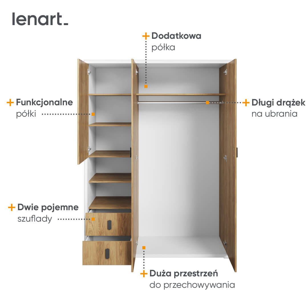 Nowatorska konstrukcja szafy 3d2s w kolorystyce białej i hikora naturalnej, harmonijnie łączy w sobie duży potencjał przechowalniczy z wyrafinowanym stylem, idealnie wpisujemy się w różnorodne preferencje estetyczne i funkcjonalne. Oferując szerokość 150 cm, wysokość 200 cm i głębokość 55 cm, szafa MT-01 stanowi prawdziwe serce organizacji domowego porządku, niezależnie od tego, czy dominuje u Ciebie minimalizm, czy eklektyzm.