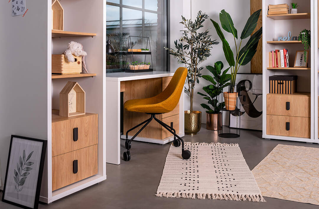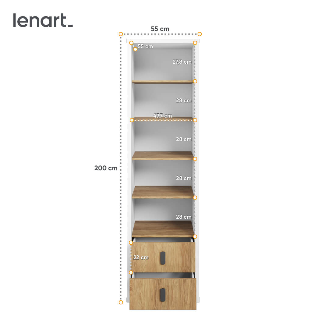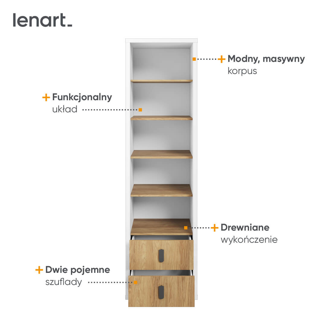 Dzięki swoim wymiarom (szerokość: 55 cm, wysokość: 200 cm, głębokość: 55 cm) regał SIMI MS-03 jest doskonały do sypialni, ale z równą gracją wkomponuje się w aranżację pokoju młodzieżowego czy innego pomieszczenia, wymagającego dodatku charakteru i funkcjonalności. Jego nowoczesny design w kolorach białym oraz hikora naturalna łatwo dopasuje się do wielu stylów wnętrzarskich, tworząc ciepłą i zapraszającą atmosferę.