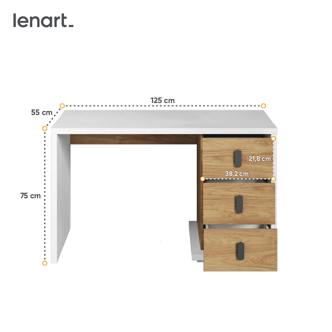 Biurko SIMI MS-06 wyróżnia się masywnym blatem o wymiarach 125 cm szerokości, 75 cm wysokości i 55 cm głębokości, zapewniającym wystarczającą przestrzeń do nauki, pracy czy twórczych zabaw. Blat wykonany z płyty wiórowej laminowanej o grubości 32mm i obrzeżach o wykończeniu S 1,70mm i oklejone na wszystkich czterech krawędziach, gwarantuje stabilność oraz trwałość na wiele lat użytkowania.