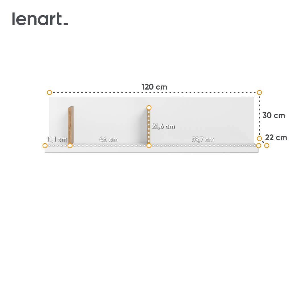 Nowoczesna półka wisząca SIMI MS-07 w bieli z akcentami naturalnego drewna łączy funkcjonalność z elegancją. Idealna do przechowywania książek, wytrzymała i łatwa w montażu, o szerokości 120 cm.