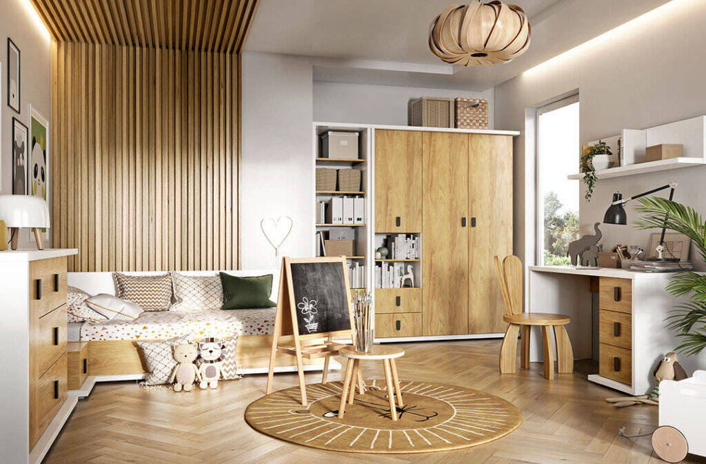 Półka MS-07 charakteryzuje się wymiarami 120 cm szerokości, 30 cm wysokości oraz 22 cm głębokości. Kolorystyka, łącząca biel z naturalnym odcieniem hikory, wnosi odrobinę ciepła, tworząc harmonijną i spokojną atmosferę w każdym pomieszczeniu, szczególnie w pokoju młodzieżowym, gdzie design i ergonomia idą w parze. Wykonana z wysokiej jakości płyty wiórowej laminowanej o grubościach 16 mm oraz 32 mm, zapewnia solidność i stabilność, co gwarantuje długowieczność i bezpieczeństwo użytkowania.