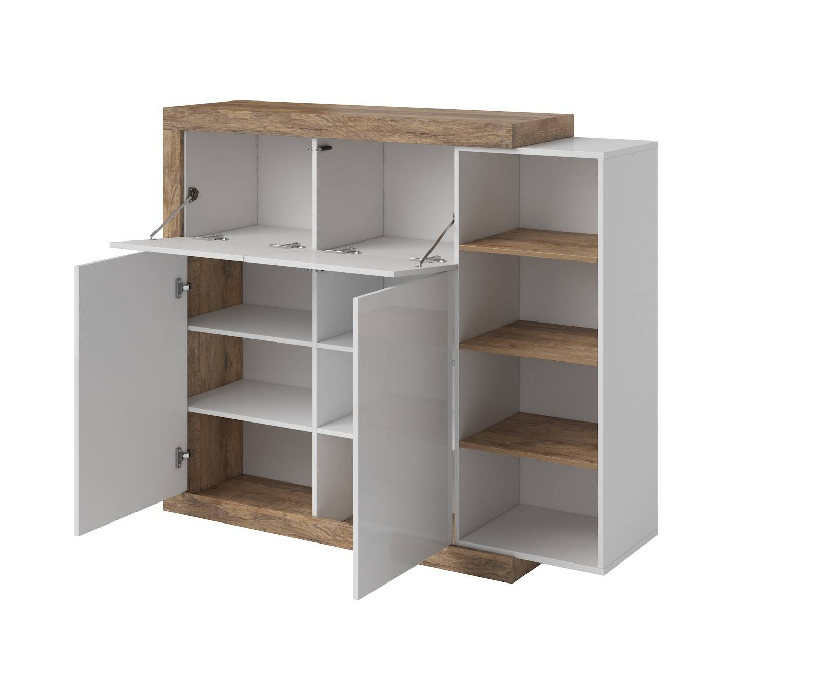 Wytworna biel frontów komody w połyskowym wykończeniu w kontraście z ciepłymi akcentami drewna dębowego sprawiają, że mebel ten staje się centralnym punktem każdego wnętrza, dodając mu zarówno elegancji, jak i przytulności. Wysokiej klasy płyta meblowa laminowana użyta do stworzenia tego mebla gwarantuje jego odporność i łatwość w utrzymaniu czystości.