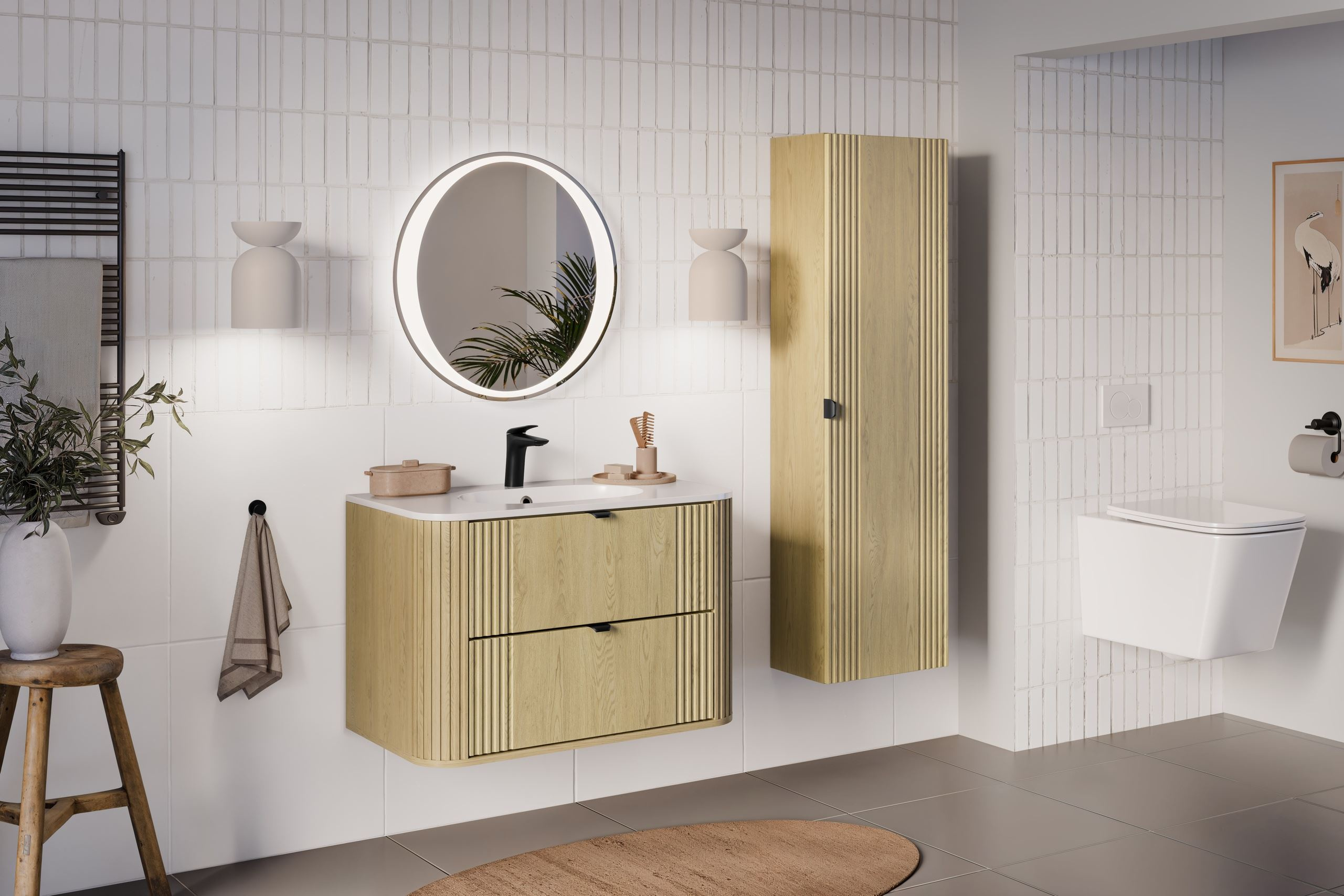 - Wysoki, 1-drzwiowy słupek Ovalia Cremona to elegancka szafka, która łączy naturalne piękno dębu z nowoczesnym designem. Wyposażona w ciche domykanie i czarne metalowe uchwyty, oferuje pojemne półki, idealne do organizacji łazienki. Polska jakość.