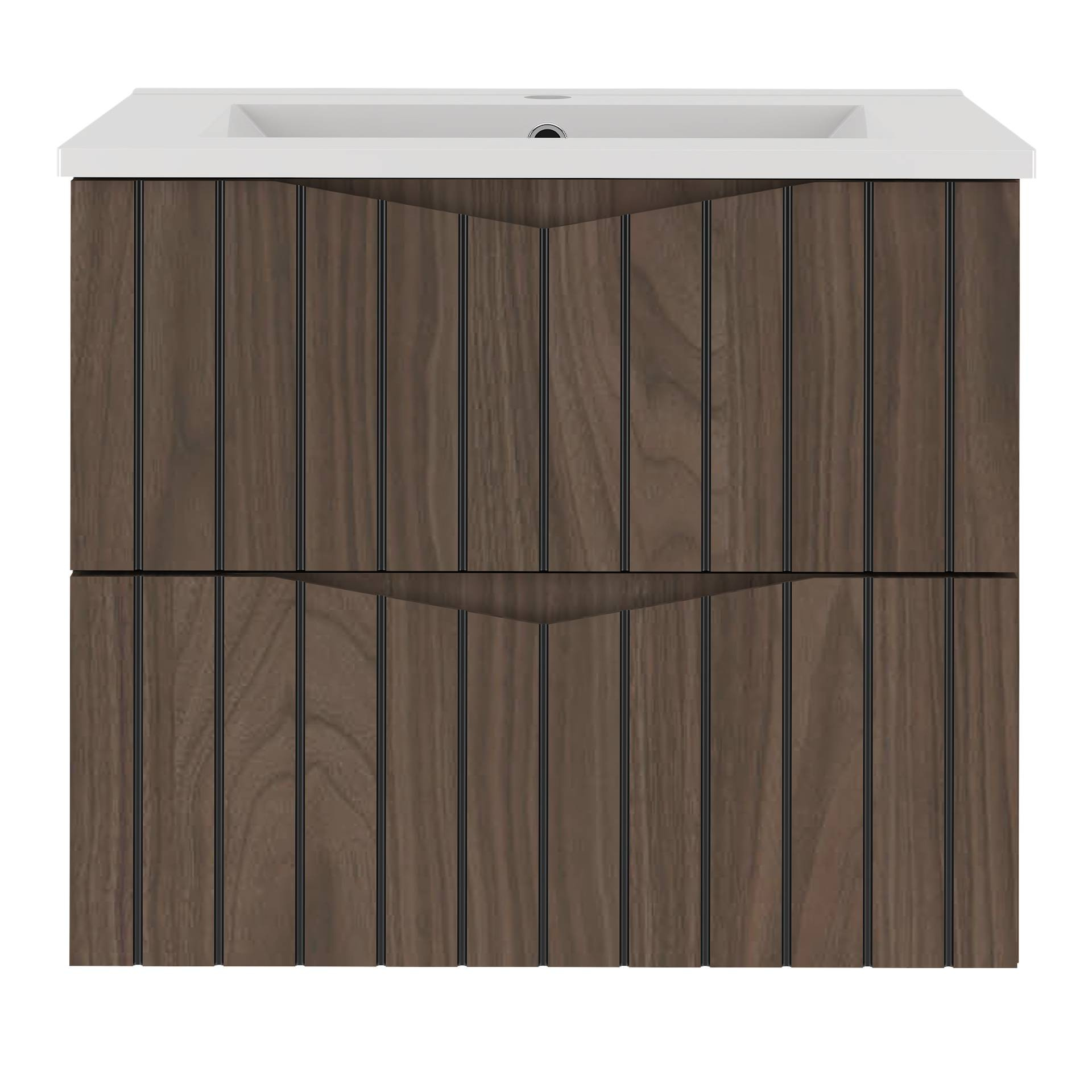 Elegancka szafka STELLA-02 z umywalką, świetnie komponująca się w każdym wnętrzu. Wykonana z płyty MDF i laminatu w kolorze orzecha, z cichym domykiem. Sanitarna umywalka wpuszczana w blat. Idealne połączenie funkcjonalności i stylu.