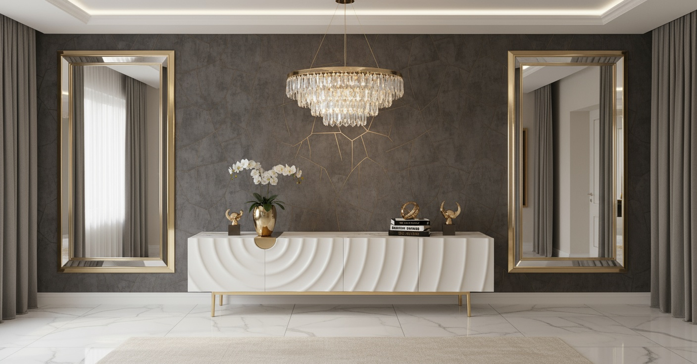 Dzięki nowoczesnym detalom, takim jak fronty z wytłoczonymi koncentrycznymi kręgami i syntetycznym marmurem na blacie, komoda ST320 wprowadza odrobinę luksusu do codzienności. Blat w połysku będzie idealnym miejscem na dekoracyjne elementy, lampy czy rodzinne zdjęcia, dodając przestrzeni blasku i elegancji.