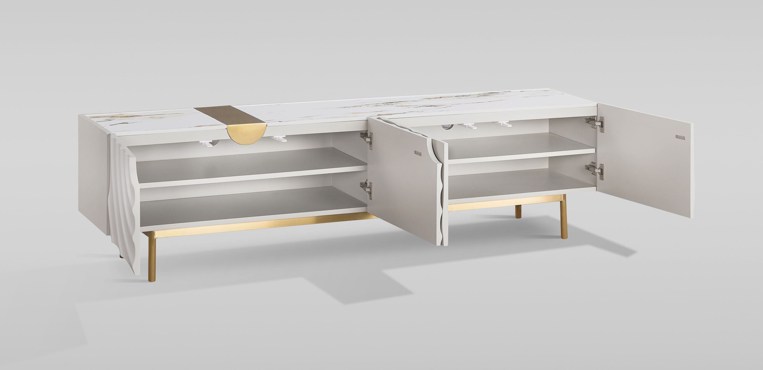 Odkryj elegancję komody RTV Stilig ST320 od Livinhill! Wykonana z MDF, marmuru syntetycznego i stali nierdzewnej, wyróżnia się białym ecru i złotymi akcentami. Jej fronty z unikalnym wzorem 3D oraz system soft close łączą styl art-deco z nowoczesną funkcj