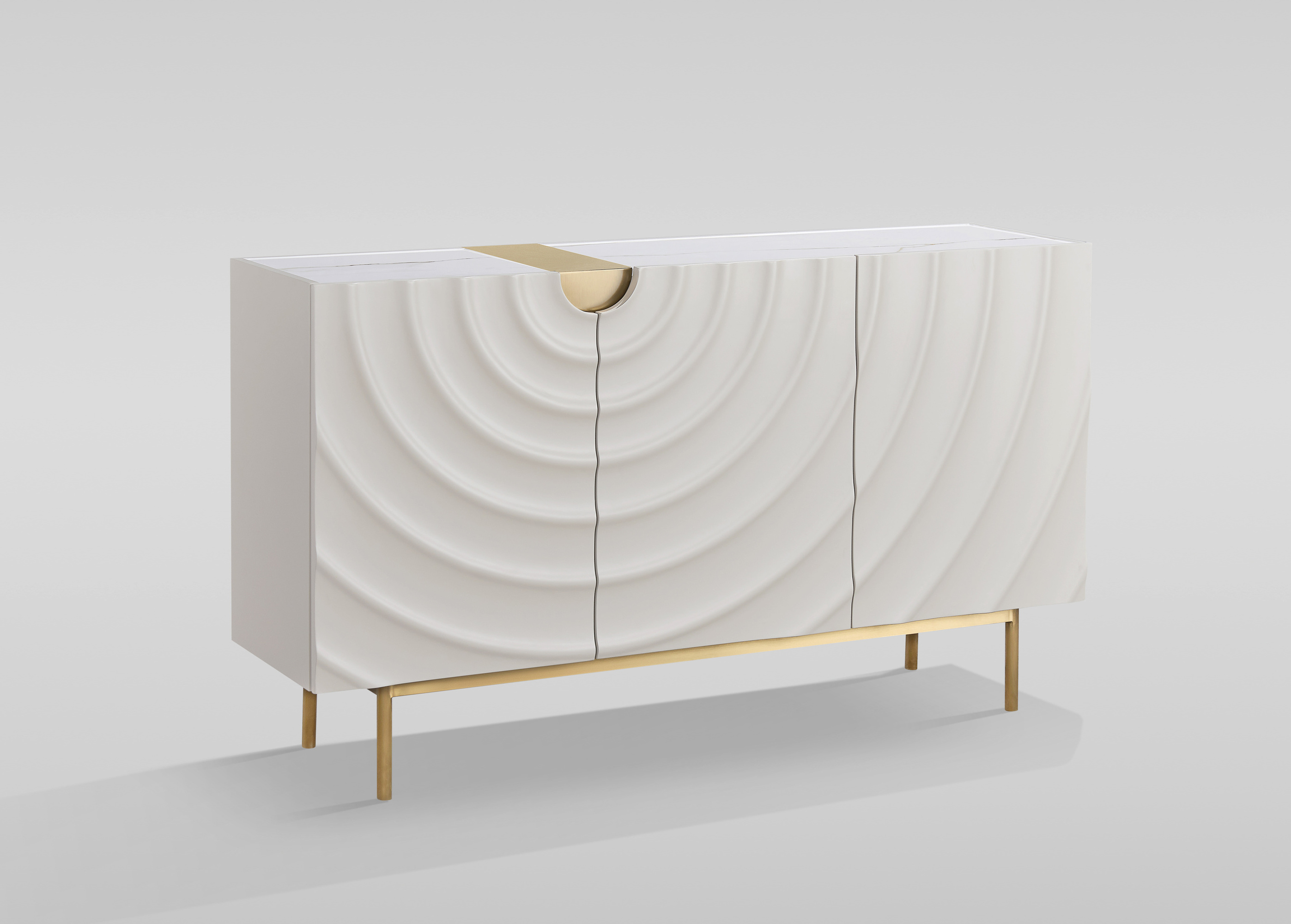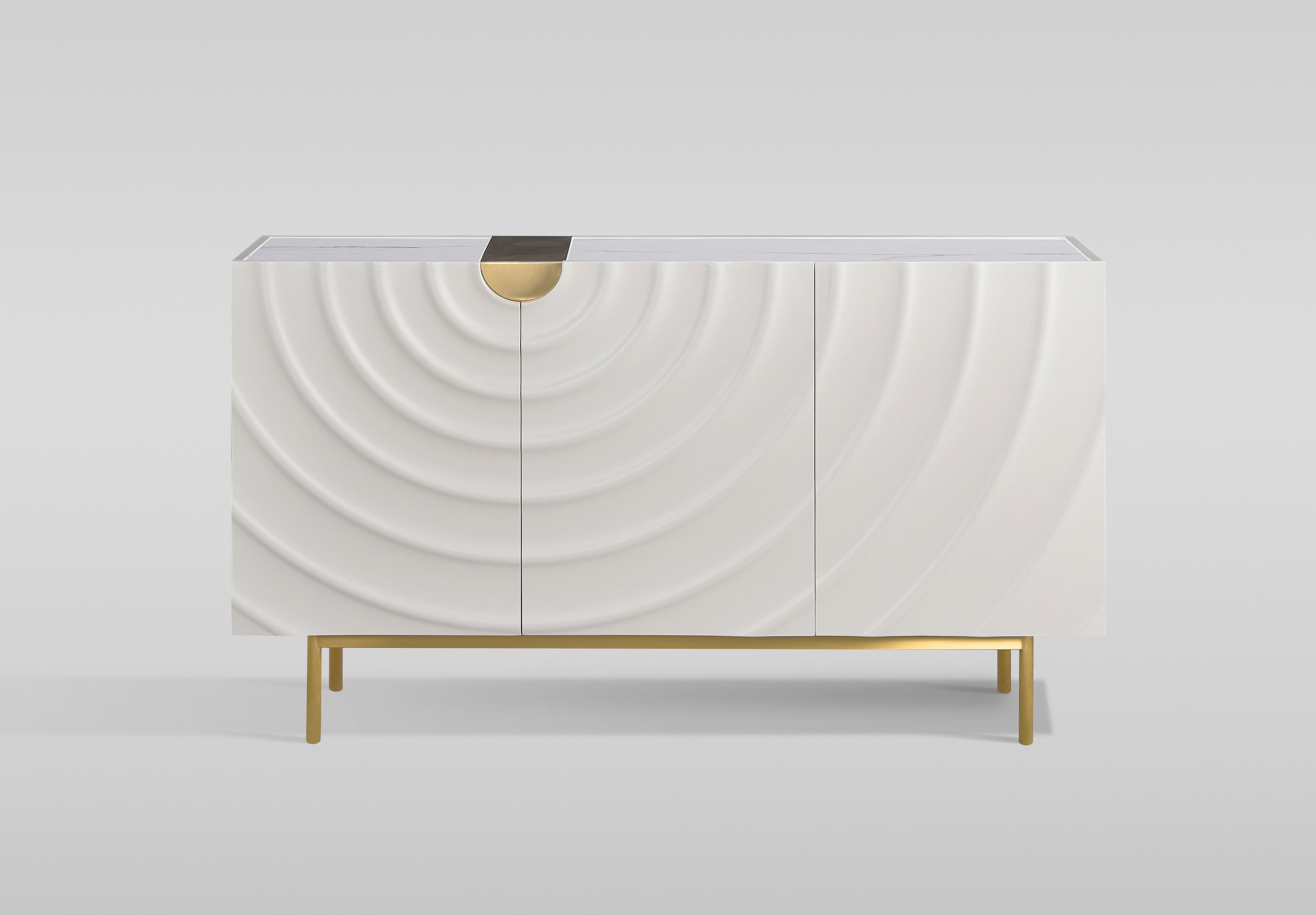 Wykonana z wysokiej jakości materiałów, takich jak MDF, marmur syntetyczny i stal nierdzewna, komoda jest nie tylko piękna, ale także solidna. Marmurowy blat w połysku to efektowny detal, który przyciąga wzrok i dodaje klasy. Wytłoczone koncentryczne kręgi na frontach drzwi to oryginalny akcent, który sprawia, że komoda wyróżnia się wśród innych produktów na rynku i stanowi prawdziwy element dekoracyjny w twoim domu.