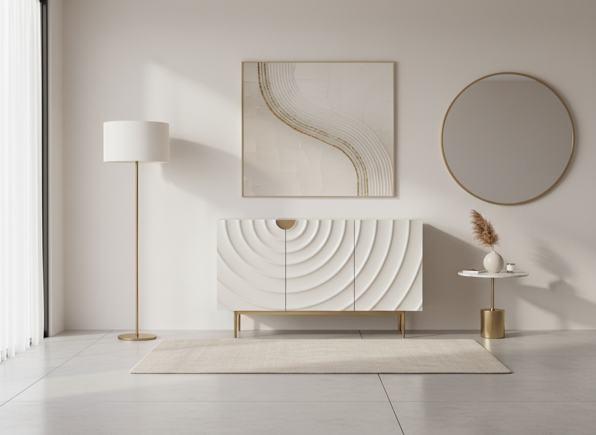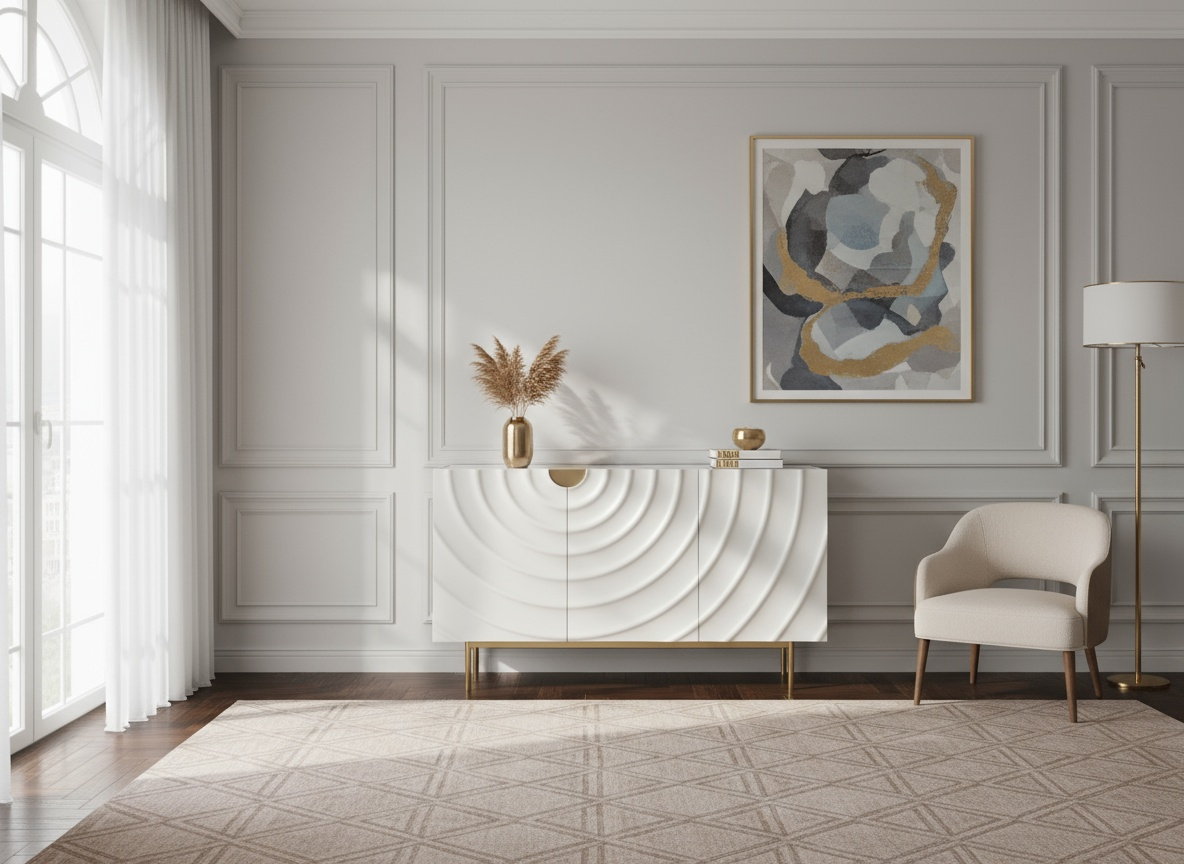 Stylowa komoda Stilig ST321 od Livinhill to połączenie elegancji i funkcjonalności. Wykonana z MDF i syntetycznego marmuru, zachwyca złotymi akcentami i wygodnym systemem push to open. Jej fronty z 3D strukturą oraz regulowane półki dodają nowoczesnego ch