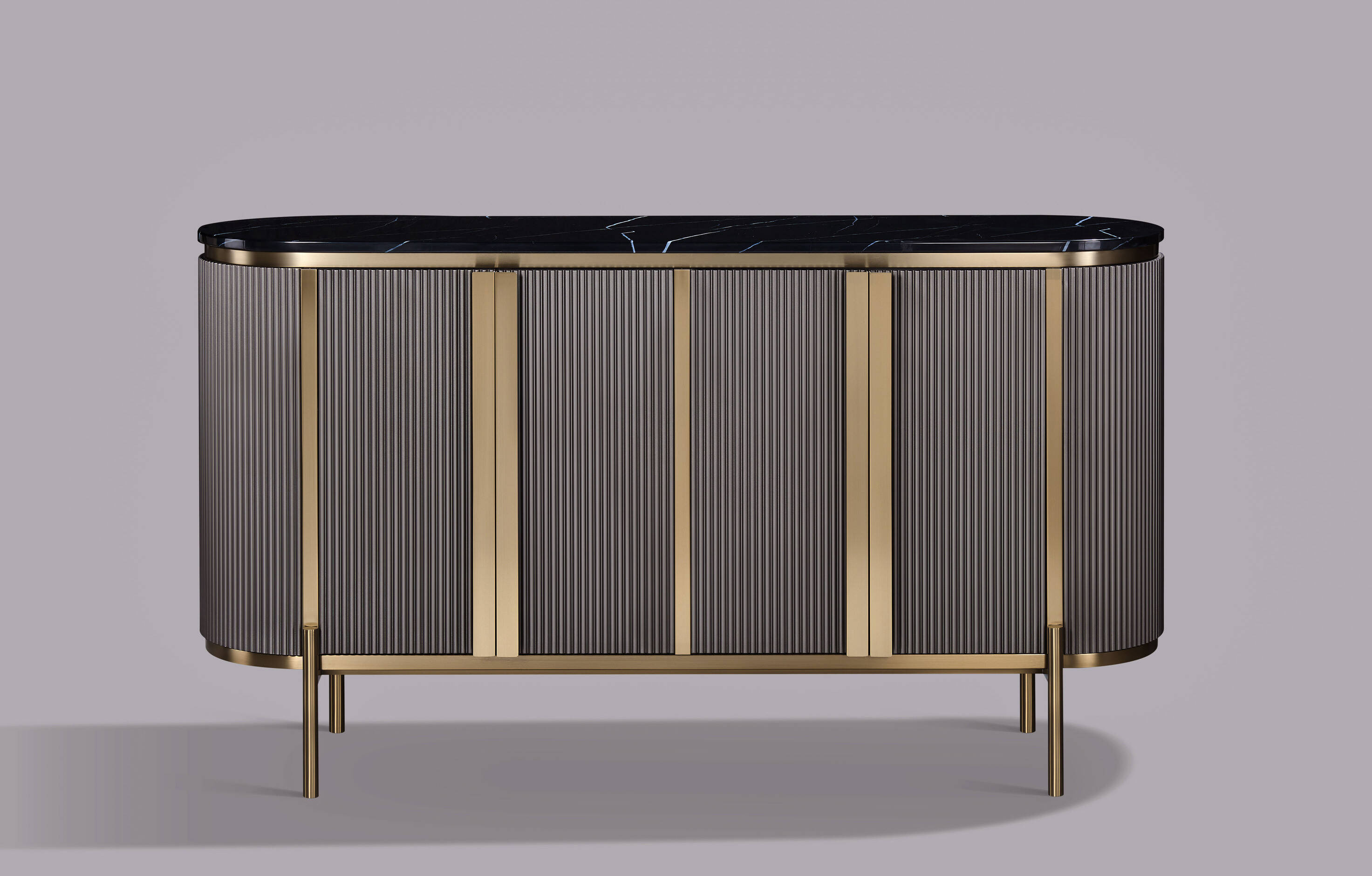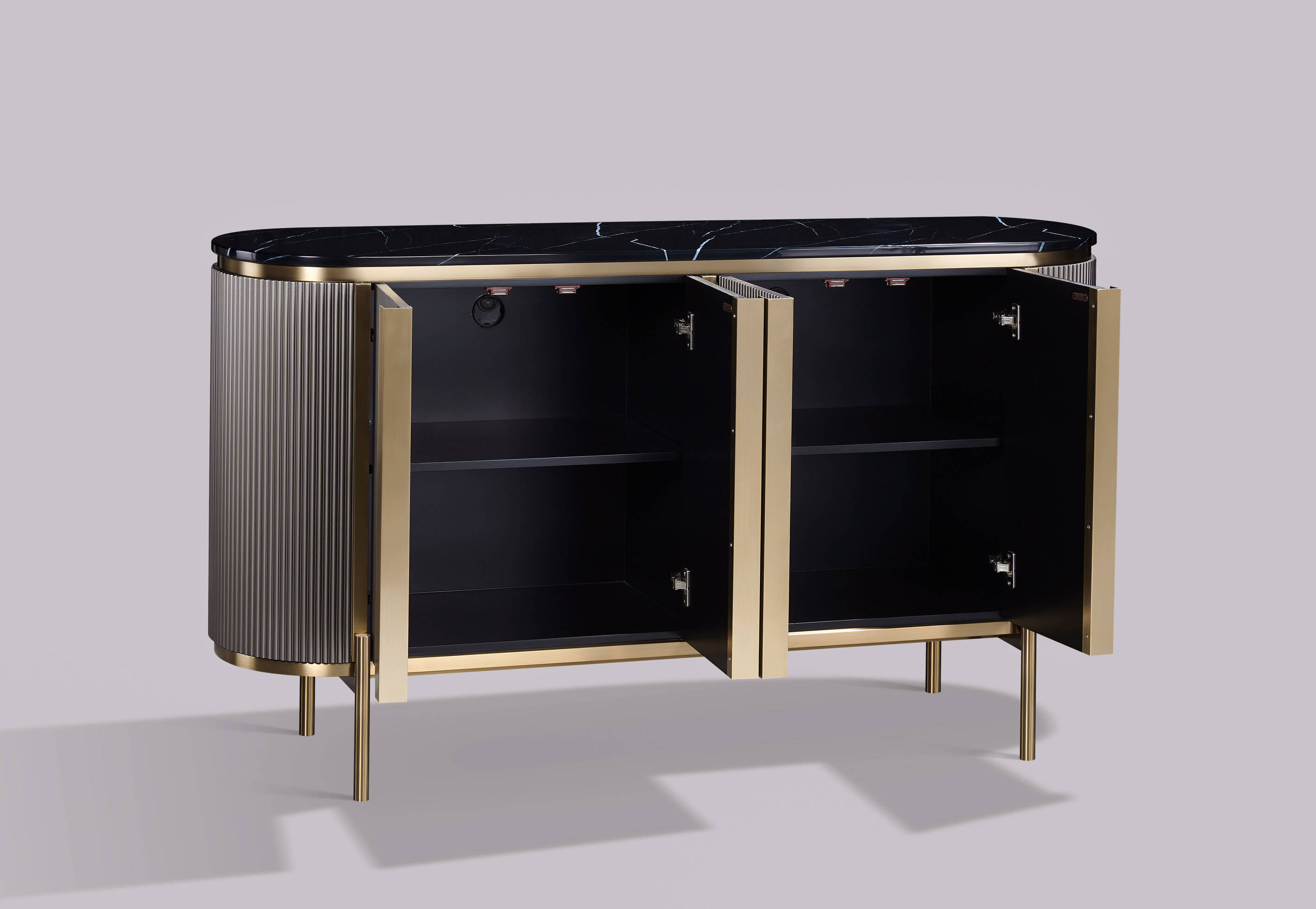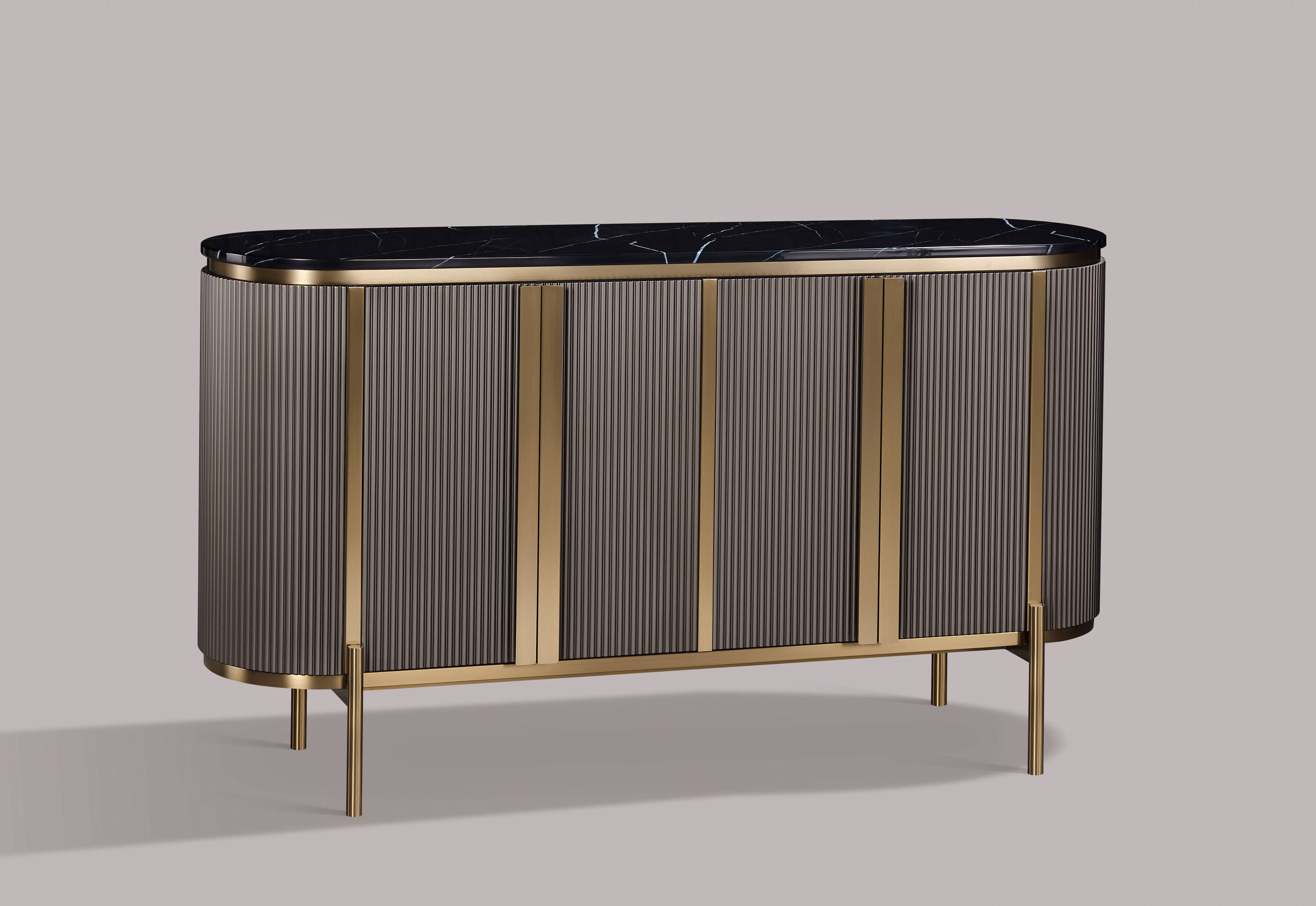 - Elegancki mebel o solidnej konstrukcji wykonany z MDF, marmuru oraz stali nierdzewnej w kolorze ciemnego grafitu z złotymi akcentami i czarnym marmurowym blatem. 4 drzwi, 2 szuflady, ryflowane drewno, metalowe uchwyty
