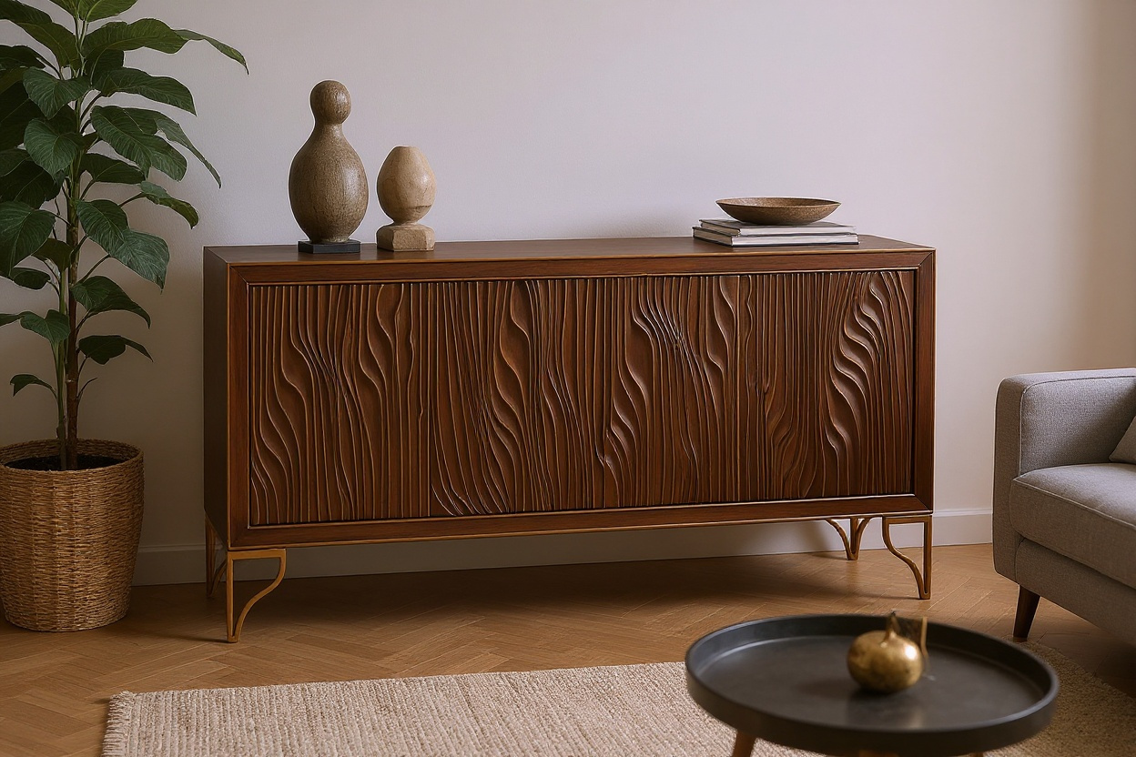 Nietuzinkowa komoda z orzecha włoskiego ze złotymi akcentami. Rzeźbiony front w 3D, system push to open, regulowane półki i system soft close. Ręcznie malowana, z efektem drewna, idealna do eleganckich wnętrz.