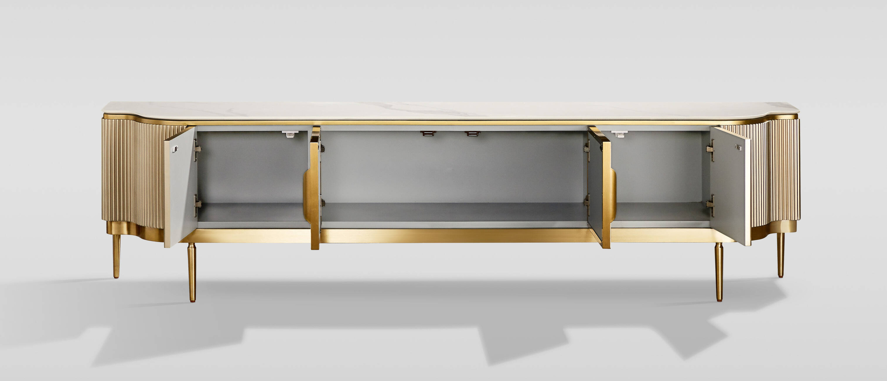 Szampańskie złoto, złote nogi i akcenty, jasnokremowy front, biały marmurowy blat